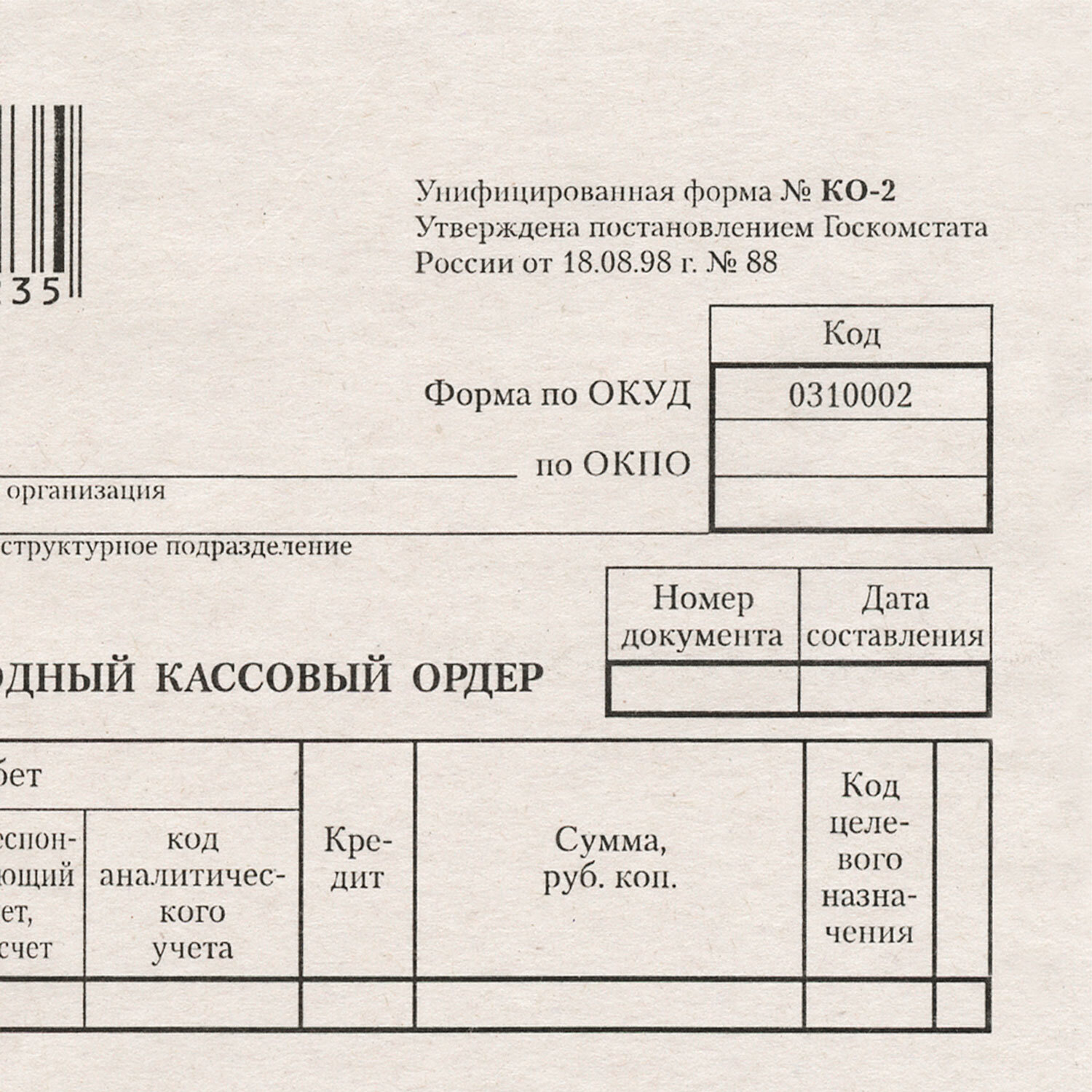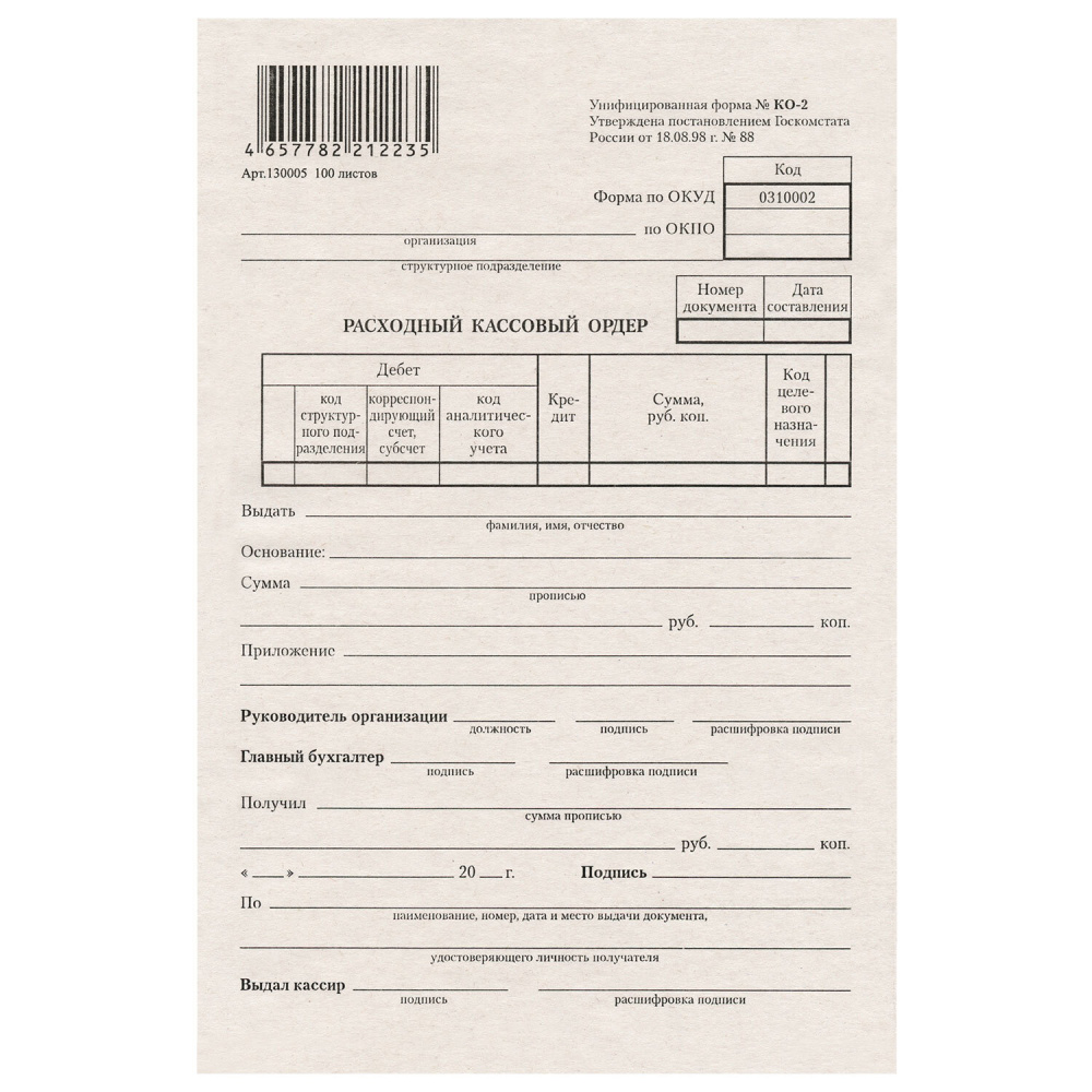 | Вид бланка | Расходный кассовый ордер |