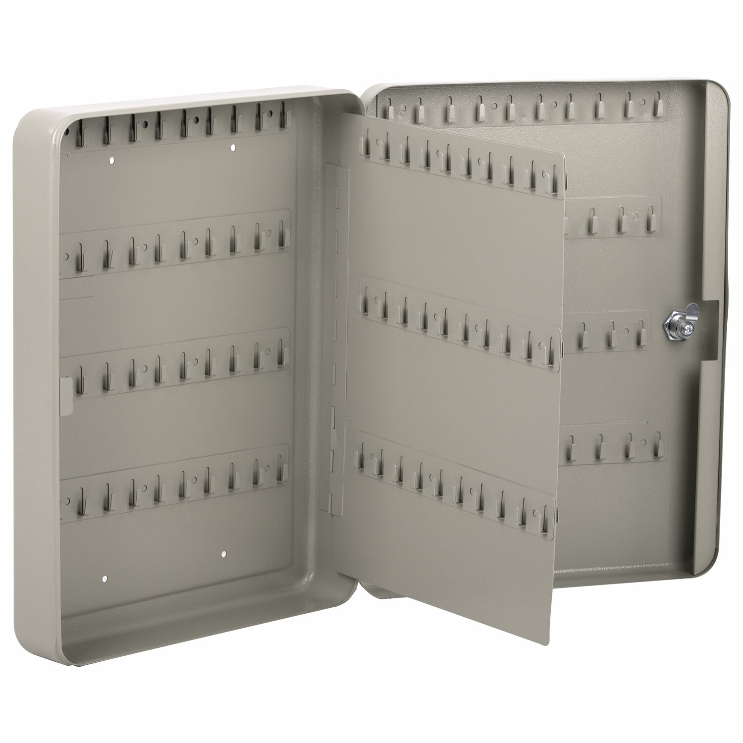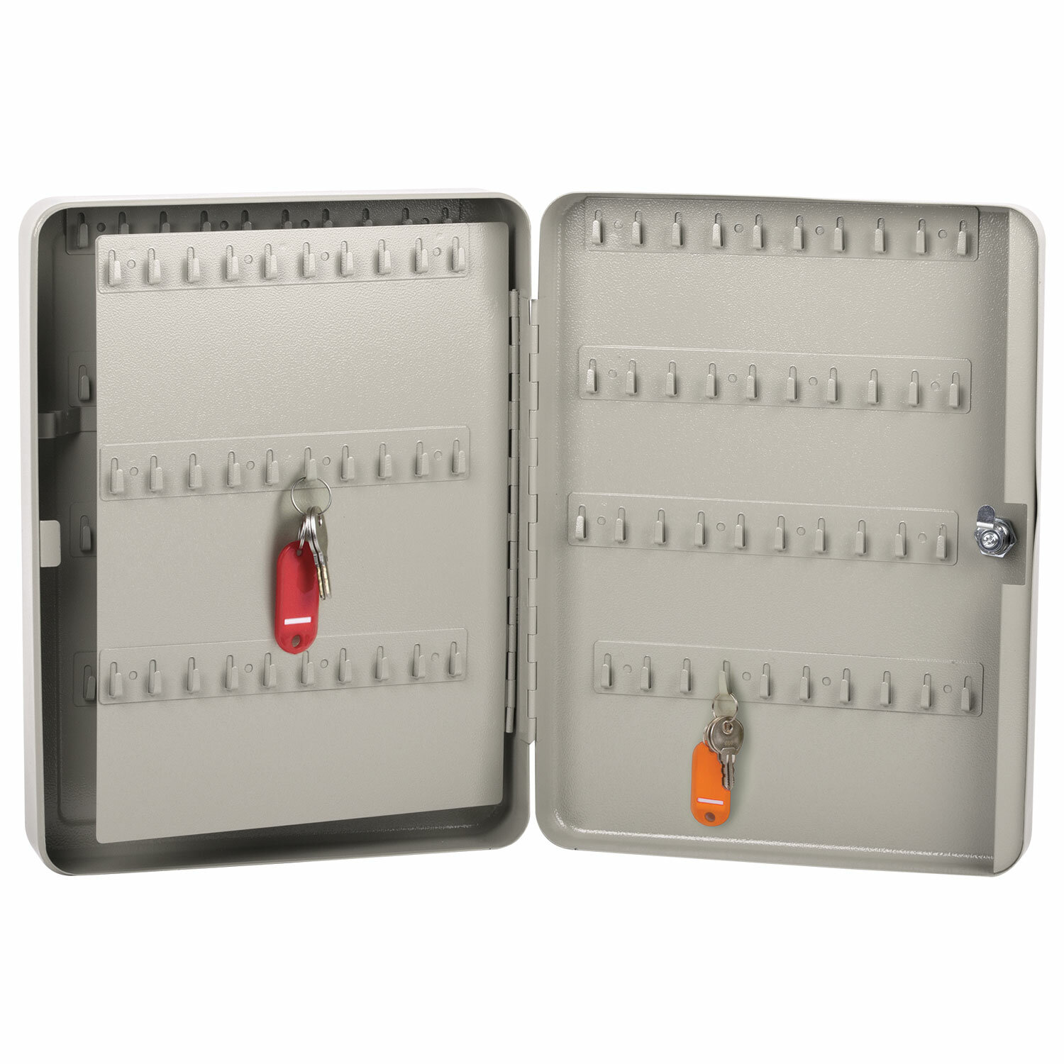 Изготовлен из прочной стали толщиной 0,8 мм и оснащен надёжным замком. Вмещает 140 ключей. Для размещения каждого ключа в шкафчике предусмотрен брелок с ярлычком. Размер - 370х280х80 мм.