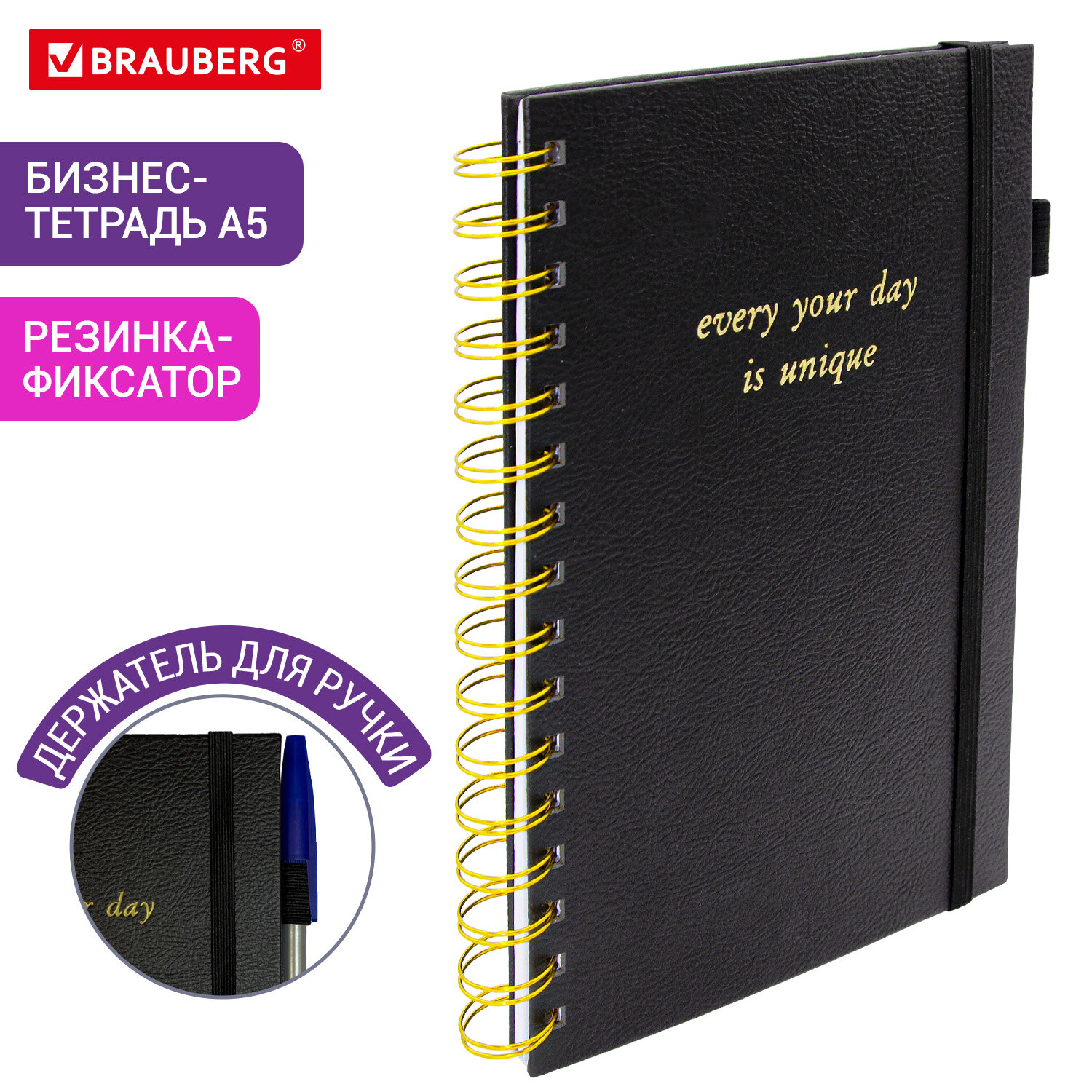 Снабжена резинкой-фиксатором, благодаря чему тетрадь не откроется в сумочке или портфеле, и листы не помнутся. Дополнением является держатель для ручки, повышающий функциональность тетради. Формат тетради А5 (148х216 мм) позволит владельцу поместить её в кейс или сумку малых габаритов.