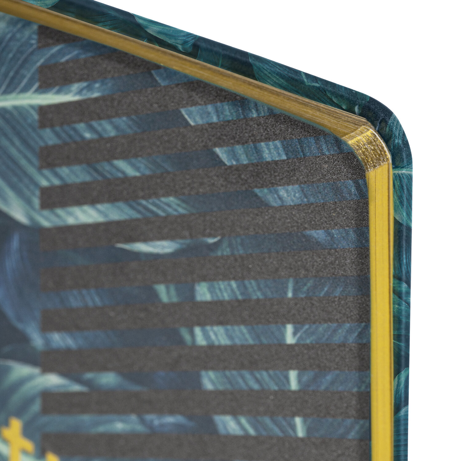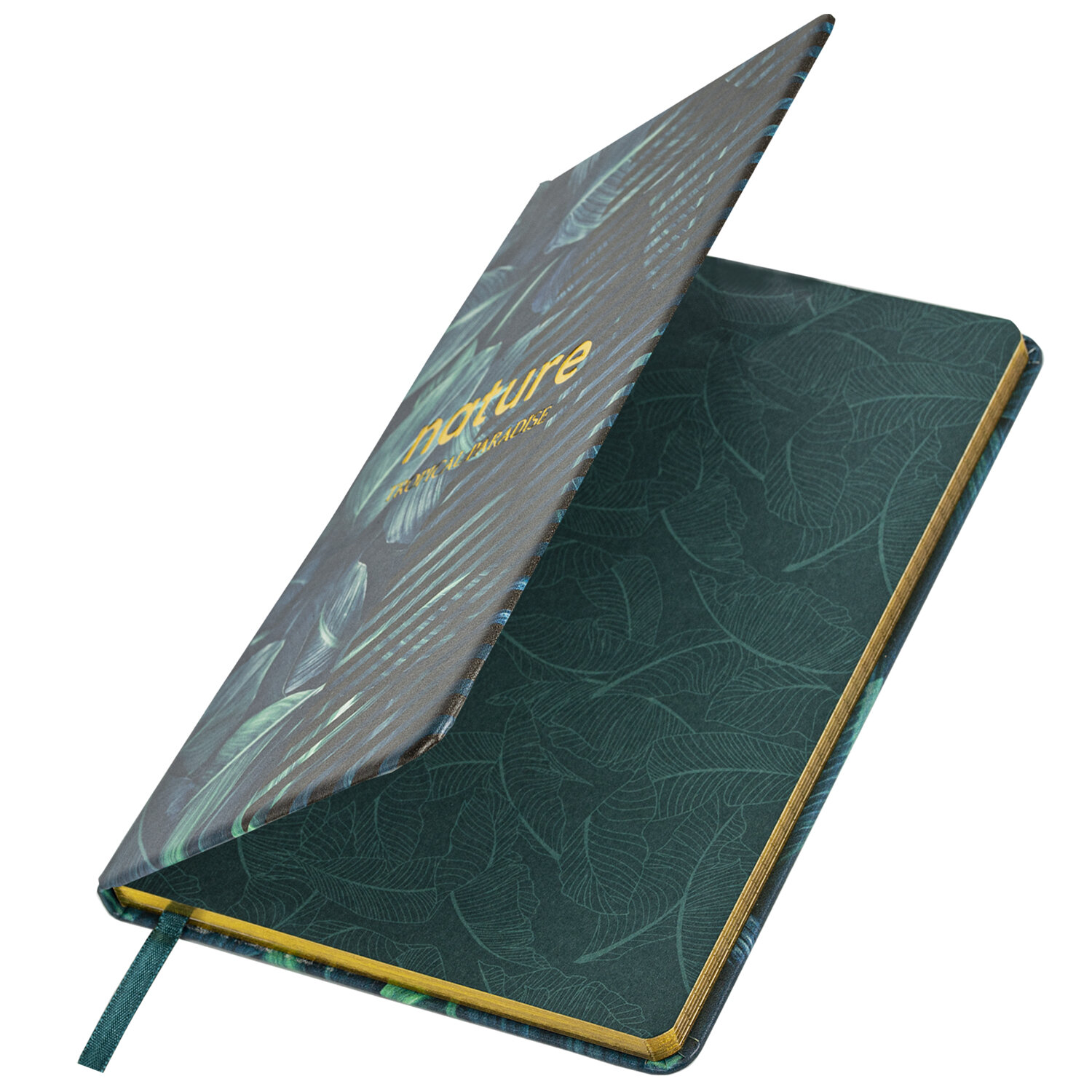 Внутренний блок включает 80 листов тонированной бумаги цвета "слоновая кость" плотностью 70 г/м2. Благодаря стандартному формату А5 блокнот удобно использовать как в офисе, так и на выездных деловых встречах. Твердая (книжная) обложка с полноцветной печатью и тиснением золотой фольгой делает блокнот неповторимым и запоминающимся. Срез блокнота фольгирован золотой фольгой, что придает ему особый шарм. Дополнением является закладка-ляссе, с помощью которой можно быстро открыть блокнот на нужной странице.