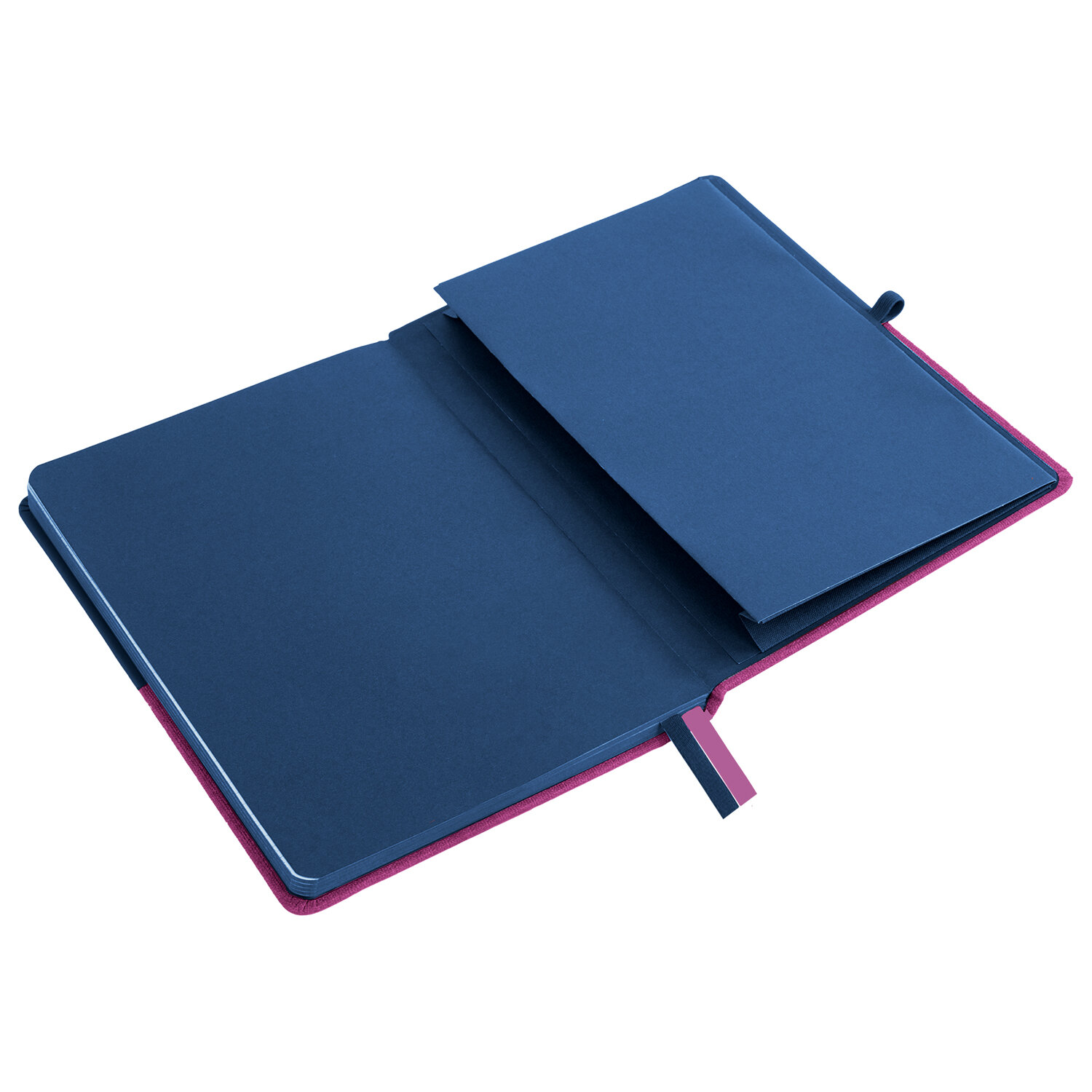Твердая обложка с использованием комбинации материалов: с фактурой "Soft Touch" и под ткань. Имеет закругленные уголки, подходит для горячего тиснения и имеет резинку-фиксатор, благодаря чему не раскроется в сумке или портфеле и листы не помнутся. На внутренней стороне задней обложки есть декоративный конверт для разных мелочей в виде визиток, напоминалок и прочего. 80 листов позволят зафиксировать большой объем информации. Линовка блока в клетку (5х5 мм) дает возможность аккуратно заполнить цифровые значения, а также нанести чертежные зарисовки. Внутренний блок выполнен из офсета цвета слоновой кости плотностью 70 г/м2 и крепится к обложке с помощью книжного переплета. Дополнением является закладка-ляссе, с помощью которой при необходимости можно быстро открыть нужную страницу. Формат блокнота А5 (148х218 мм) позволит владельцу поместить его в кейс или сумку малых габаритов.