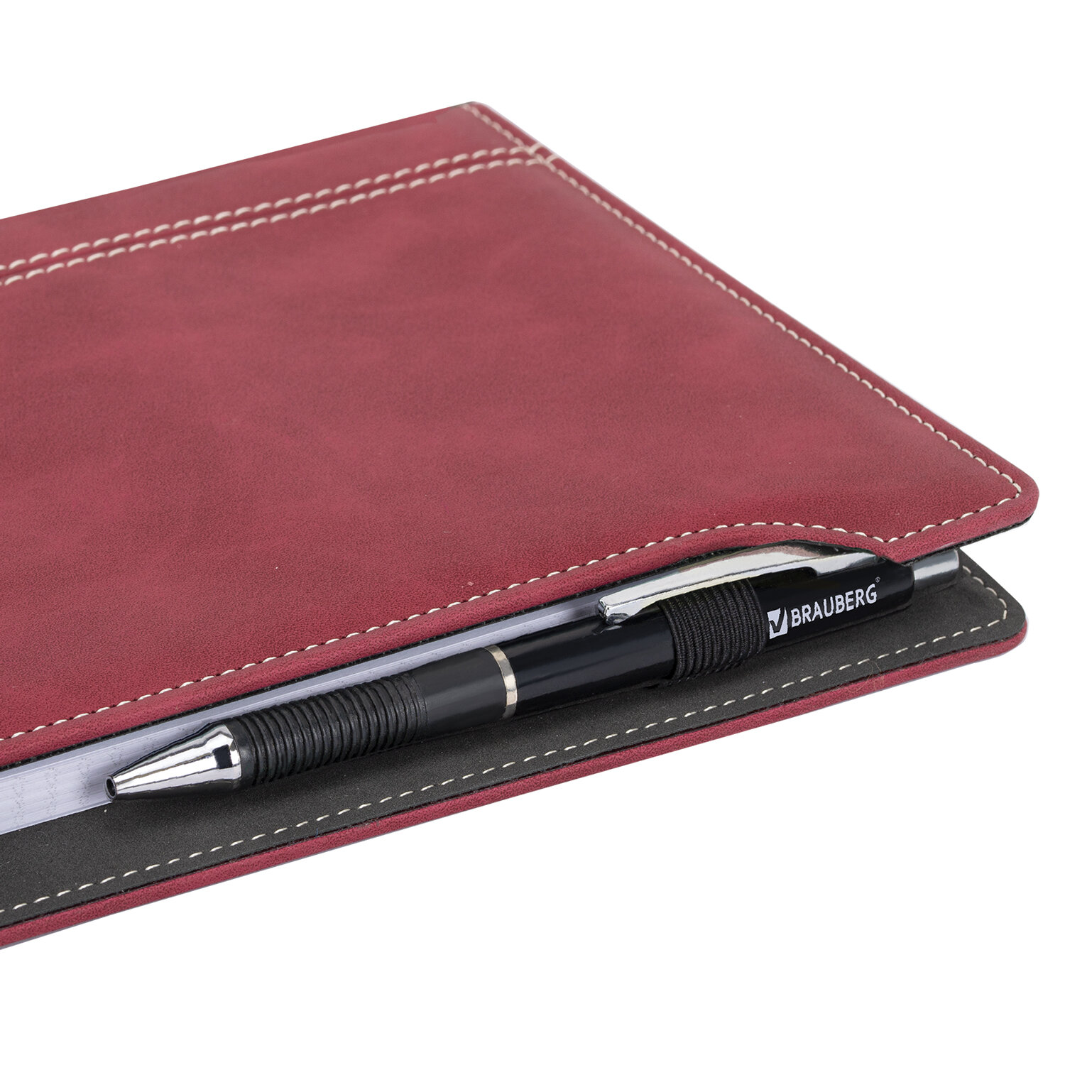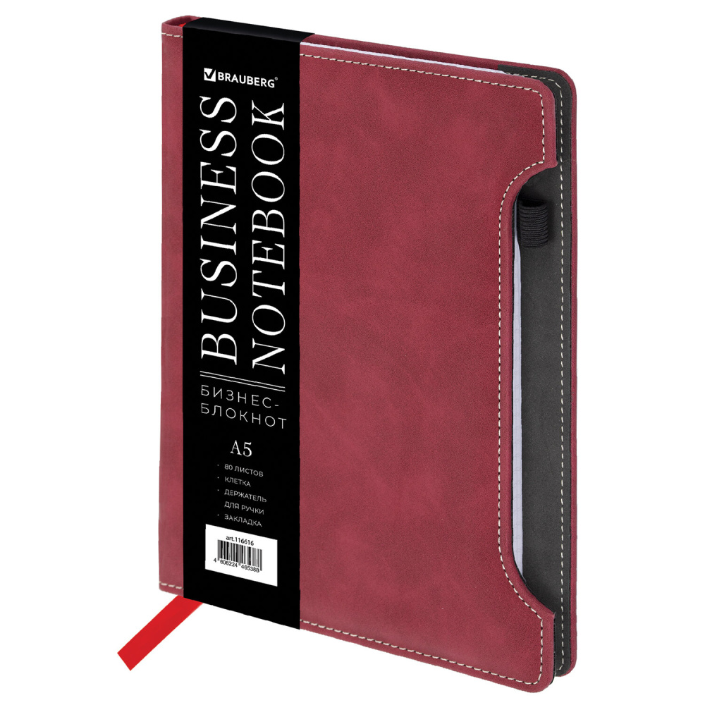 Блокнот А5 165x218 мм, BRAUBERG "Perfect", под кожу софт-тач, держатель для ручки, 80 листов, клетка, бордовый, 116616