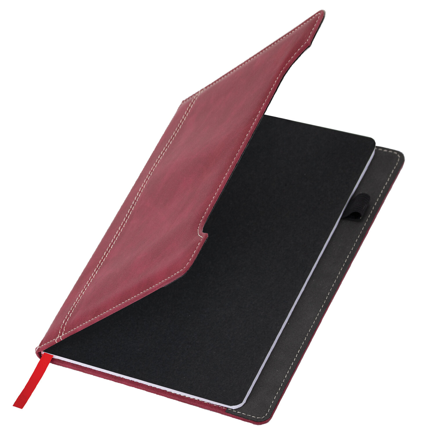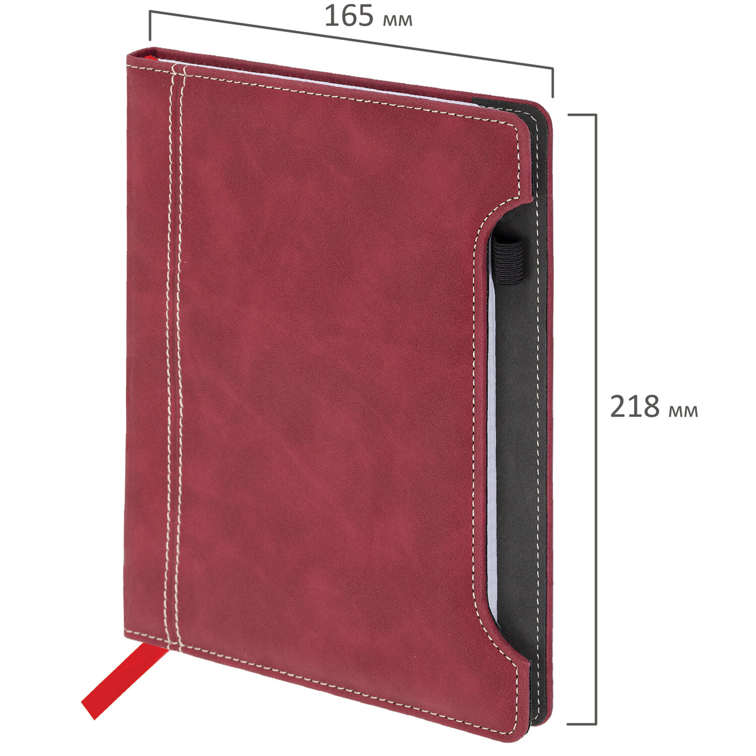 Дополнением являются держатель для ручки и закладка-ляссе, с помощью которой при необходимости можно быстро открыть нужную страницу. Формат блокнота А5 (165х218 мм) позволит владельцу поместить его в кейс или сумку малых габаритов.