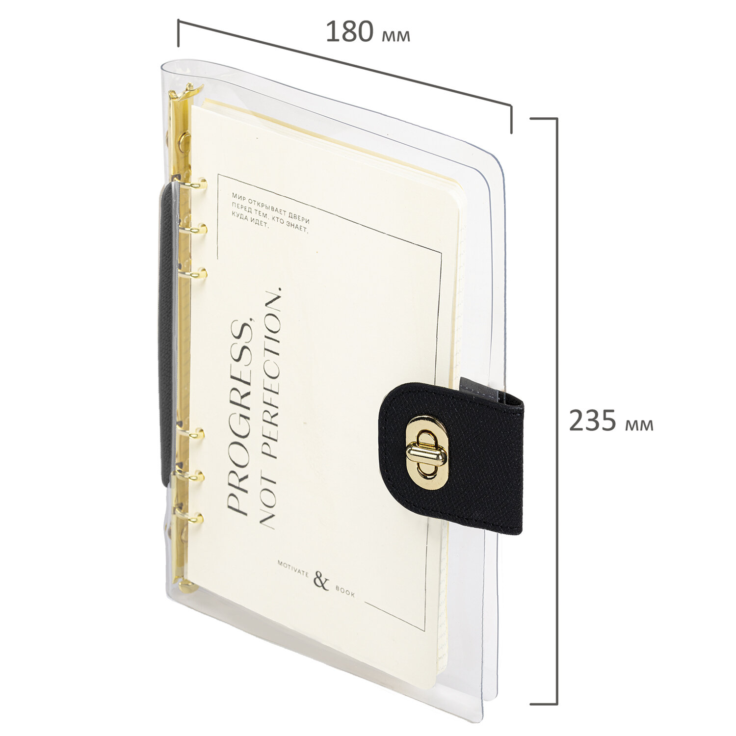 Снабжен застежкой с поворотным механизмом, благодаря чему блокнот не откроется в сумочке или портфеле, и листы не помнутся. Формат А5 (180х235 мм) позволит владельцу поместить его в кейс или сумку малых габаритов.