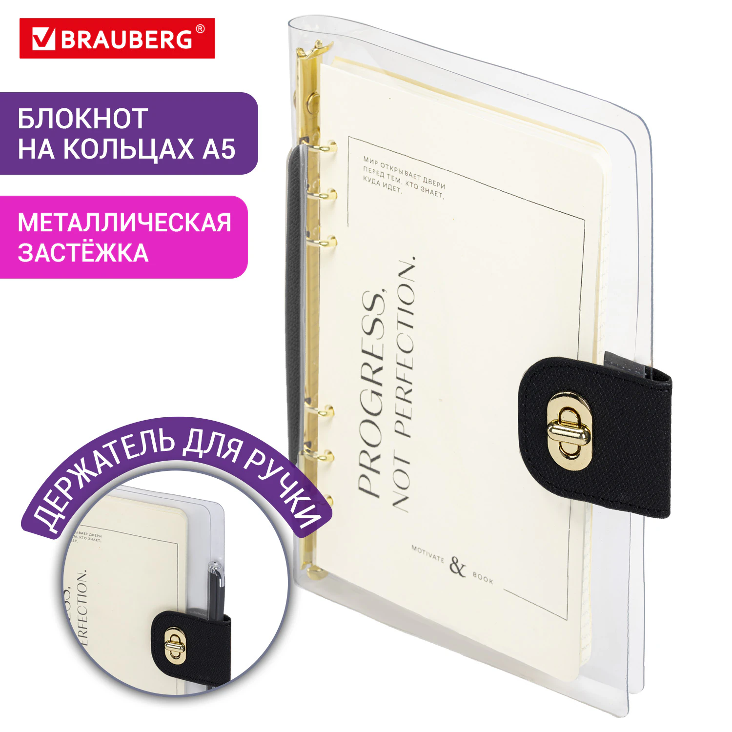 Блокнот А5 180x235 мм, BRAUBERG "Fabulous", гибкий, на кольцах, застежка, 80 л., черный, 116196