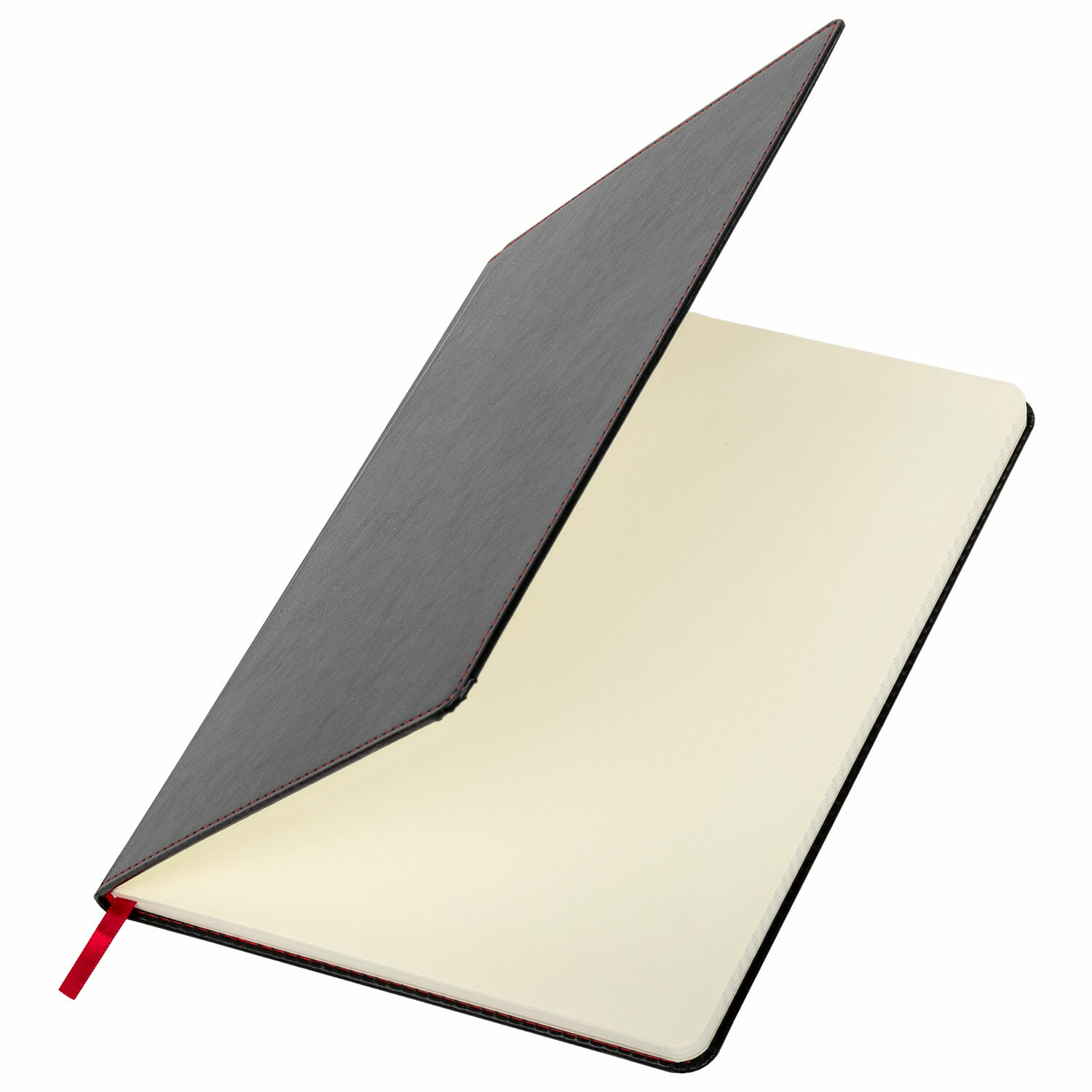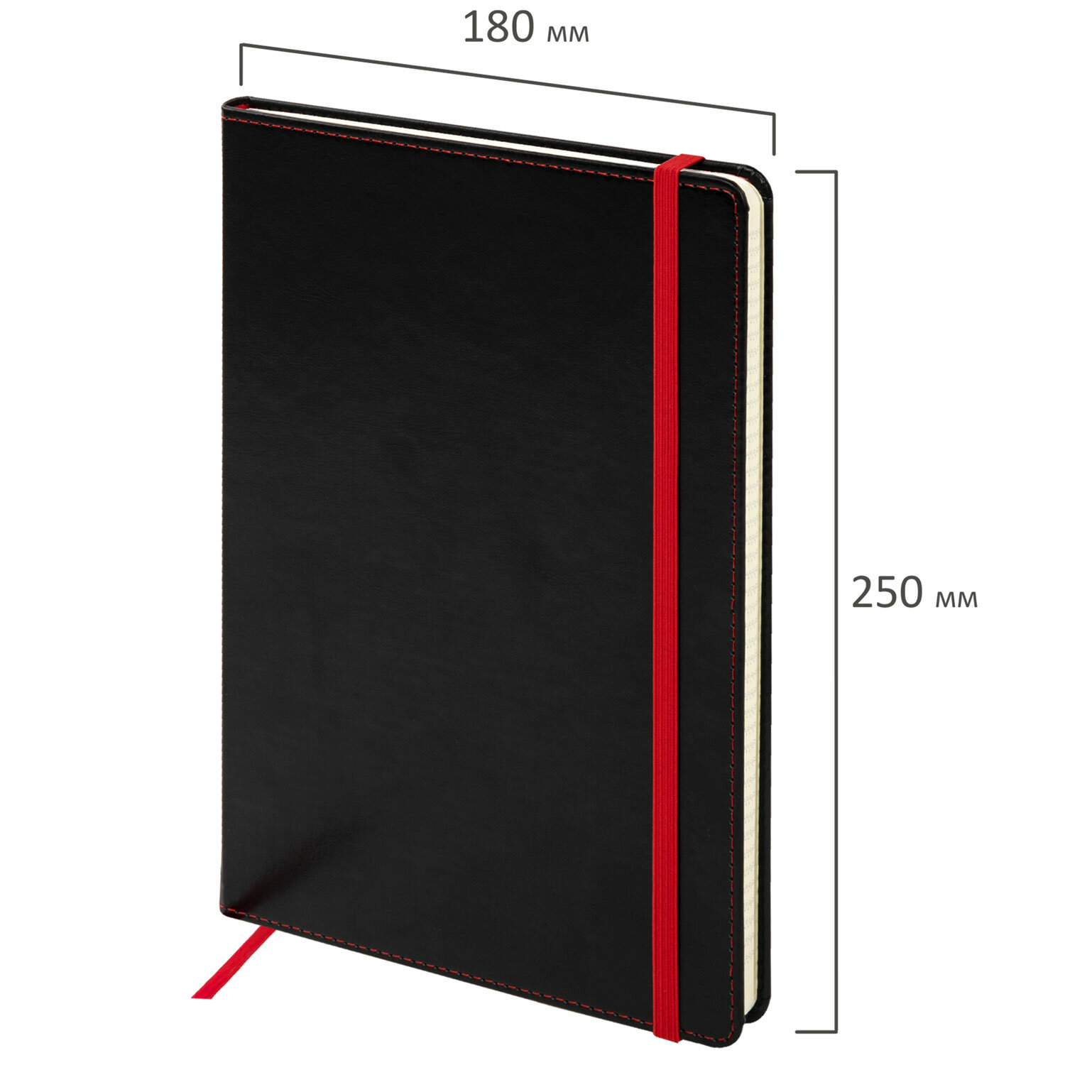 Твердая обложка стилизована под кожу черного цвета. Имеет закругленные уголки. Подходит для горячего тиснения. 80 листов позволят зафиксировать большой объем информации. Линовка блока в клетку (5х5 мм) дает возможность аккуратно заполнить цифровые значения, а также нанести чертежные зарисовки. Внутренний блок выполнен из офсета тонированного цвета плотностью 70 г/м2 и крепится к обложке с помощью книжного переплета. На внутренней стороне задней обложки есть декоративный конверт для разных мелочей в виде визиток, напоминалок и т. д. Снабжен резинкой-фиксатором, благодаря чему блокнот не откроется в сумочке или портфеле и листы не помнутся. Резинка-фиксатор и прострочка по периметру блокнота окрашены на контрасте цвета обложки, что придает блокноту изысканность и шарм. Дополнением является закладка-ляссе, с помощью которой при необходимости можно быстро открыть нужную страницу. Формат блокнота В5 (180х250 мм).