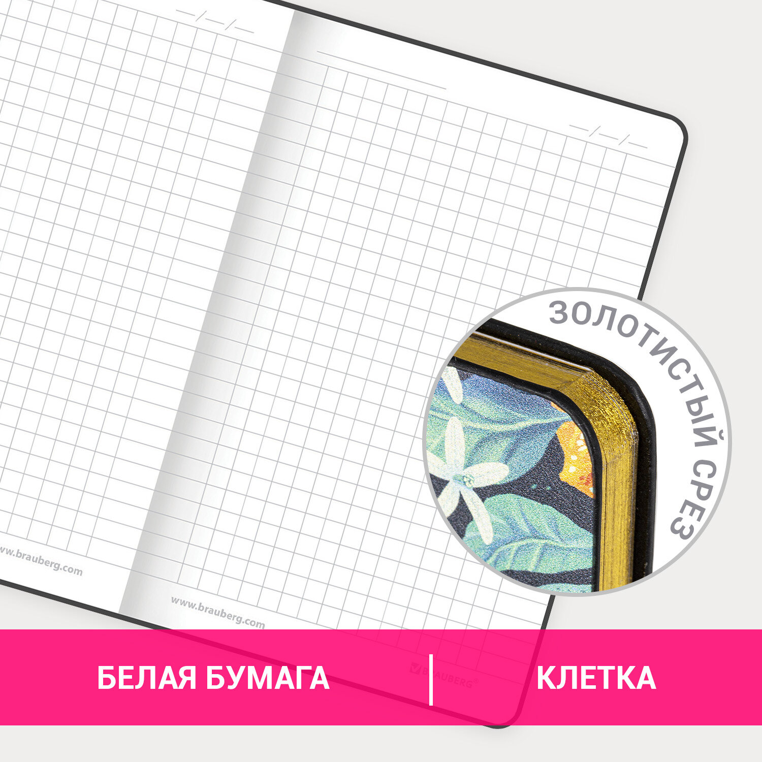Внутренний блок включает 80 листов белой бумаги плотностью 70 г/м2. Благодаря малому формату А6 блокнот удобно использовать как в офисе, так и на выездных деловых встречах. Интегральная (мягкая) обложка с полноцветной печатью и тиснением золотой фольгой делает блокнот неповторимым и запоминающимся. Срез блокнота фольгирован золотой фольгой, что придает ему особый шарм. Дополнением является закладка-ляссе, с помощью которой можно быстро открыть блокнот на нужной странице.