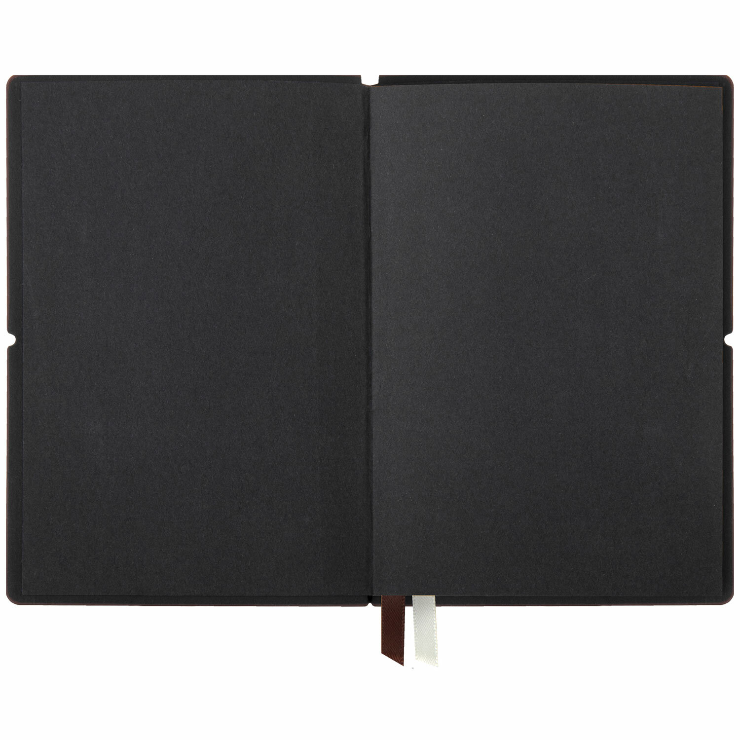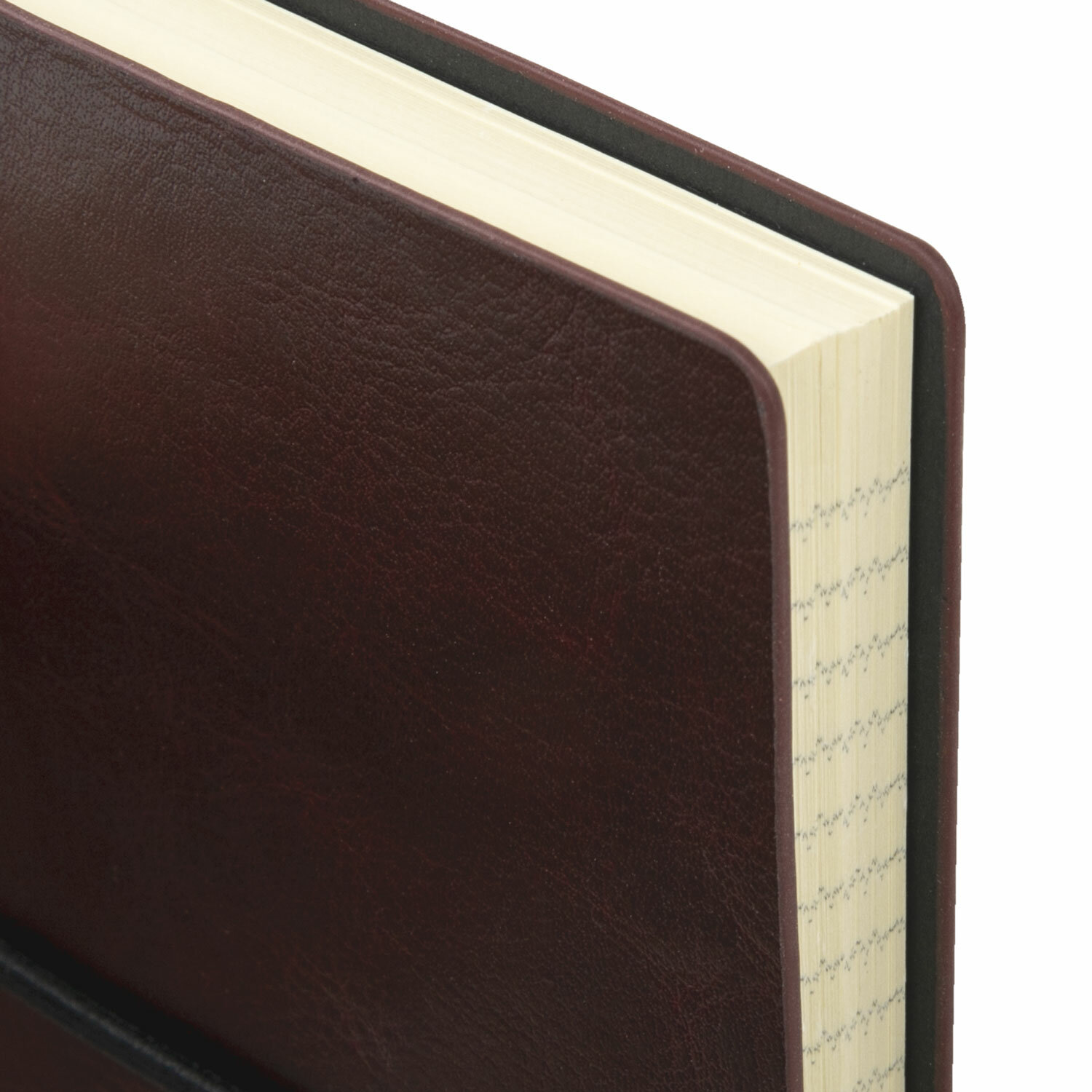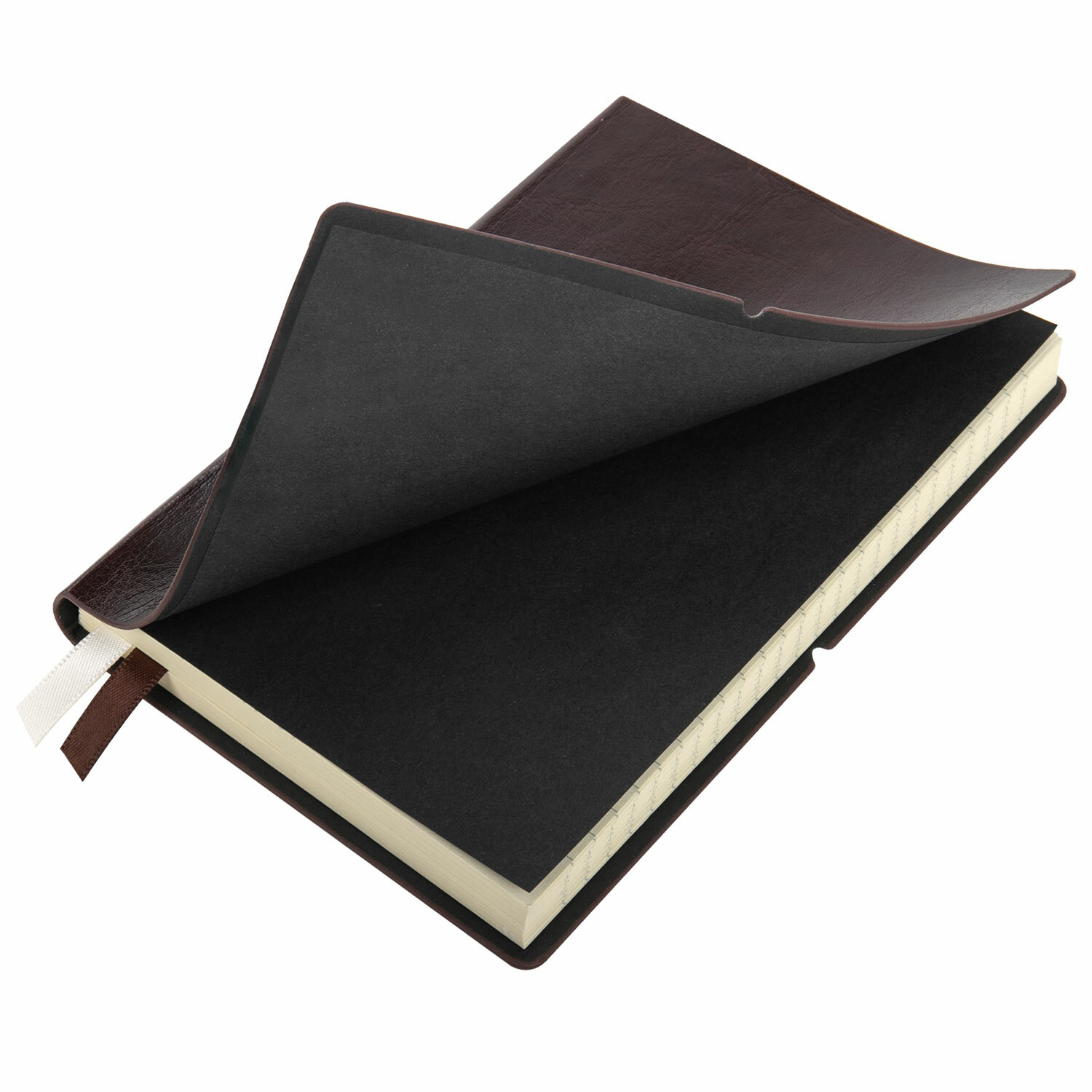 Мягкая интегральная обложка стилизована под кожу. Имеет закругленные уголки. Подходит для горячего тиснения. 128 листов позволят зафиксировать большой объем информации. Линовка блока в клетку дает возможность аккуратно заполнить цифровые значения, а также нанести чертежные зарисовки. Внутренний блок выполнен из офсета кремого цвета плотностью 70 г/м2 и крепится к обложке с помощью книжного переплета. Снабжен резинкой-фиксатором, благодаря чему не откроется в сумке или портфеле и листы не помнутся. Дополнением является закладка-ляссе, с помощью которой при необходимости можно быстро открыть нужную страницу. Формат блокнота А6 (100х150 мм) позволит владельцу поместить его в кейс или сумку габаритов. Поставляется в индивидуальной упаковке (полибег).