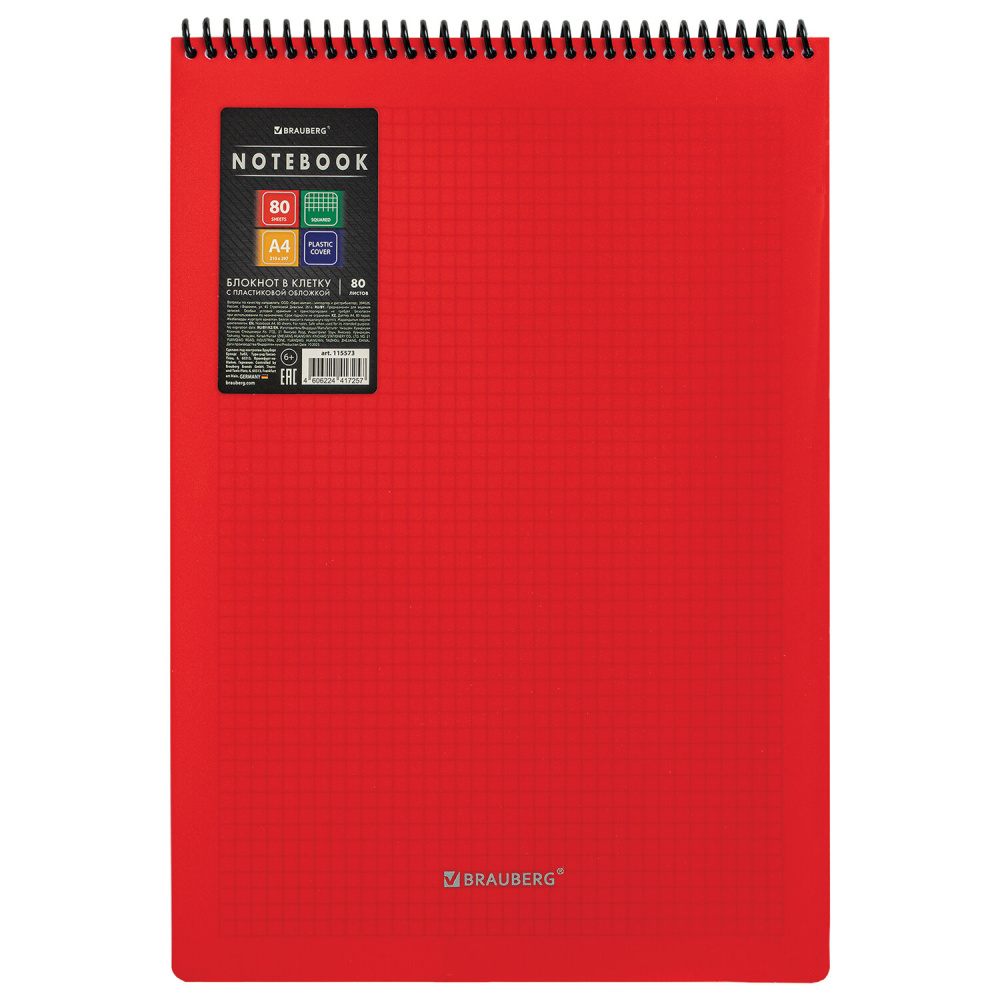 Блокнот формата А4 на спирали содержит 80 листов с линовкой в клетку, что позволяет зафиксировать большой объем нужной информации. Имеет верхнее расположение переплета. Обложка выполнена из пластика, что делает блокнот более износоустойчивым. Внутренний блок состоит из белой офсетной бумаги плотностью 70 г/м2.