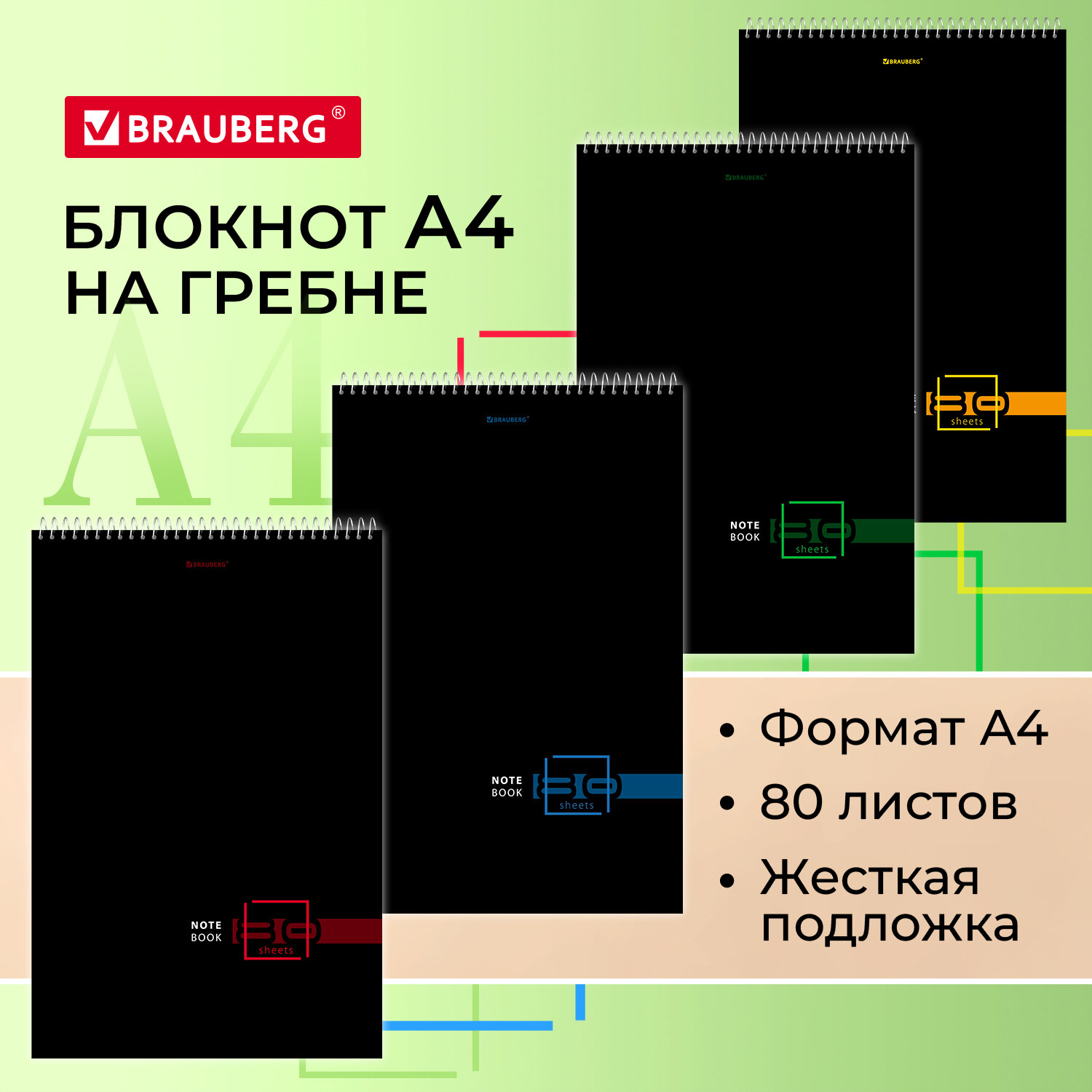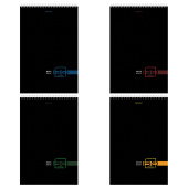 Блокнот формата А4 на евроспирали содержит 80 листов с линовкой в клетку, что позволяет зафиксировать большой объем нужной информации. Имеет жесткую подложку, позволяющую делать записи на весу. Гребень расположен сверху. Обложка выполнена из мелованного картона плотностью 190 г/м2. Внутренний блок состоит из белой офсетной бумаги плотностью 60 г/м2.