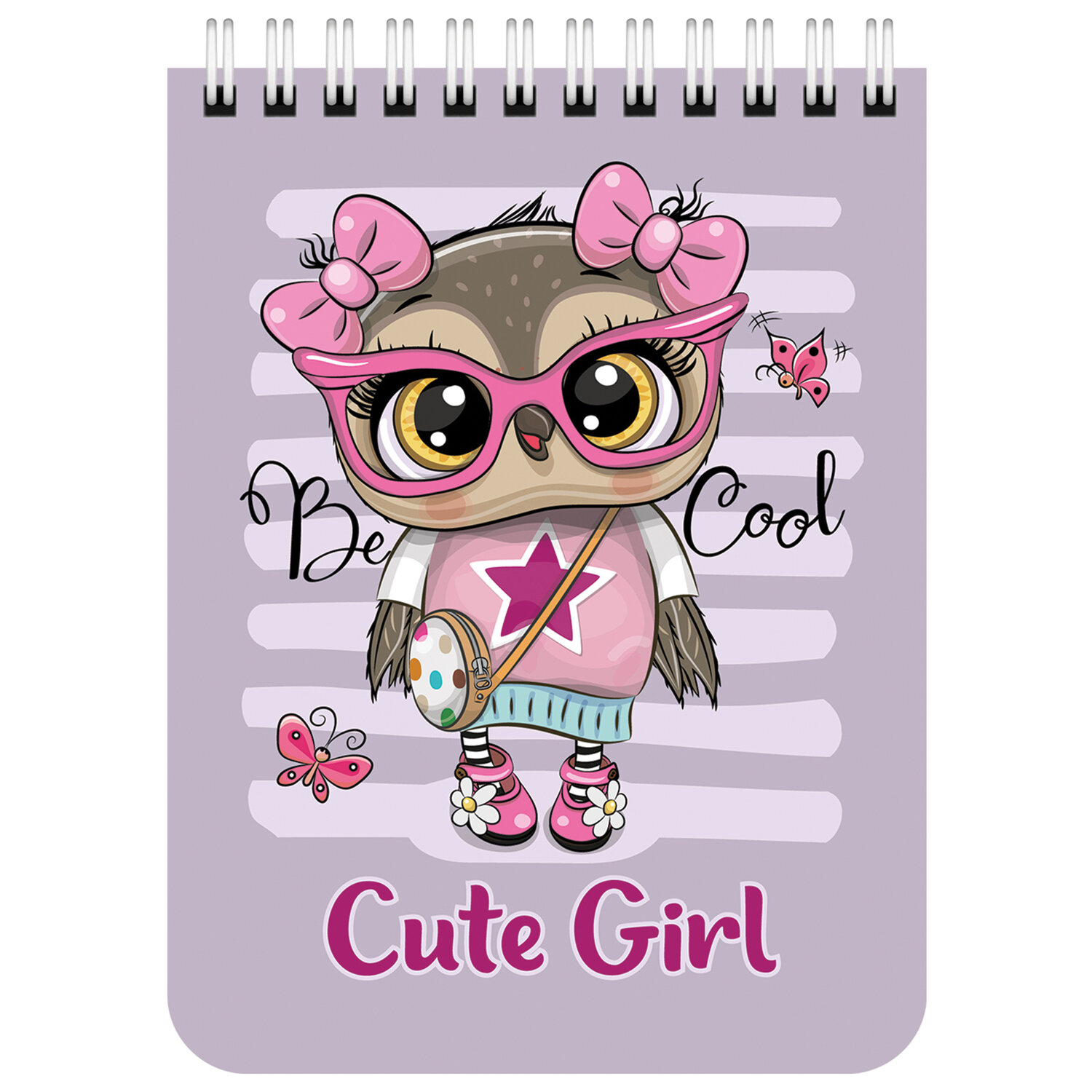 Блокнот формата А6 на евроспирали содержит 40 листов с линовкой в клетку. Гребень расположен сверху. Обложка выполнена из мелованного картона плотностью 190 г/м2. Внутренний блок состоит из белой офсетной бумаги плотностью 60 г/м2.