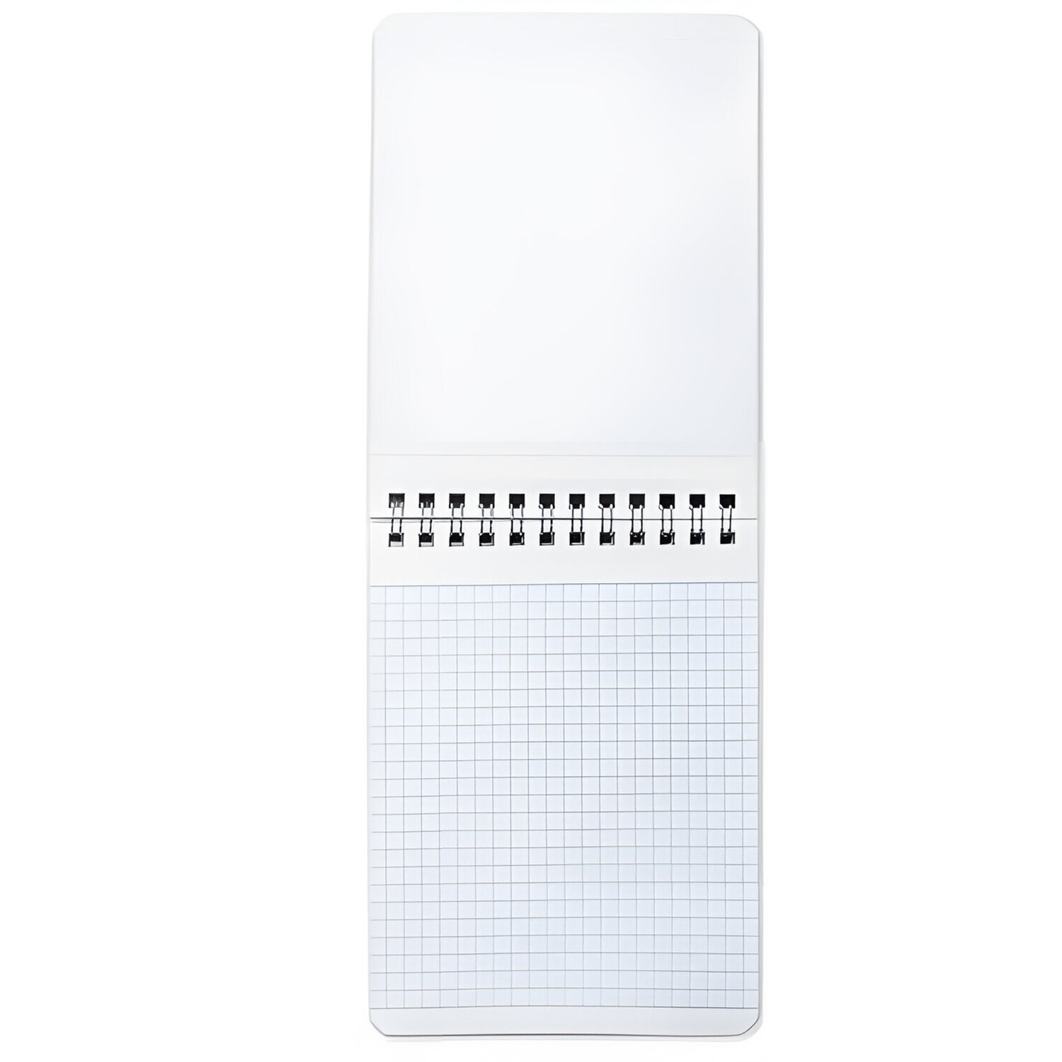 Блокнот формата А6 на гребне содержит 60 листов с линовкой в клетку. Гребень расположен сверху. Обложка выполнена из мелованного картона плотностью 190 г/м2. Внутренний блок состоит из белой офсетной бумаги плотностью 60 г/м2.