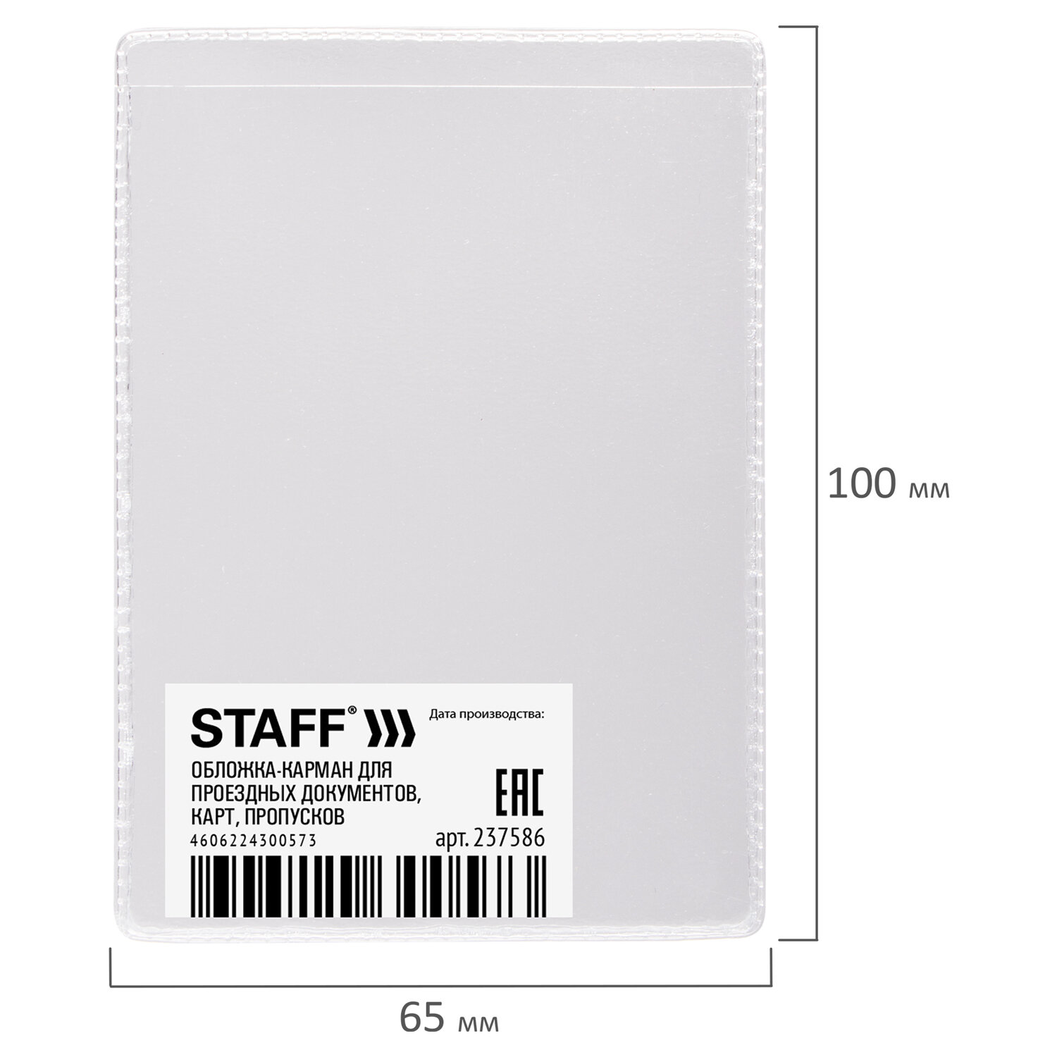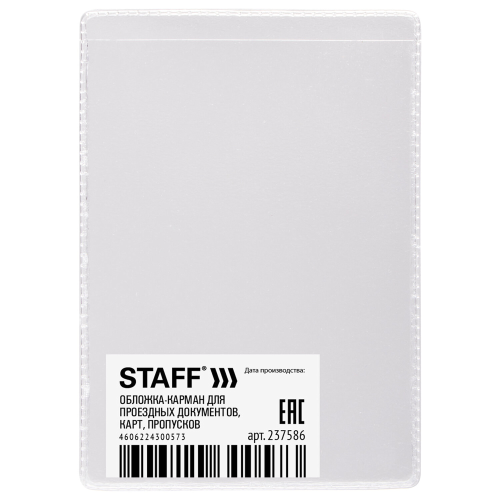 Обложка-карман для проездных документов, карт, пропусков, 100х65 мм, ПВХ, прозрачная, STAFF, 237586