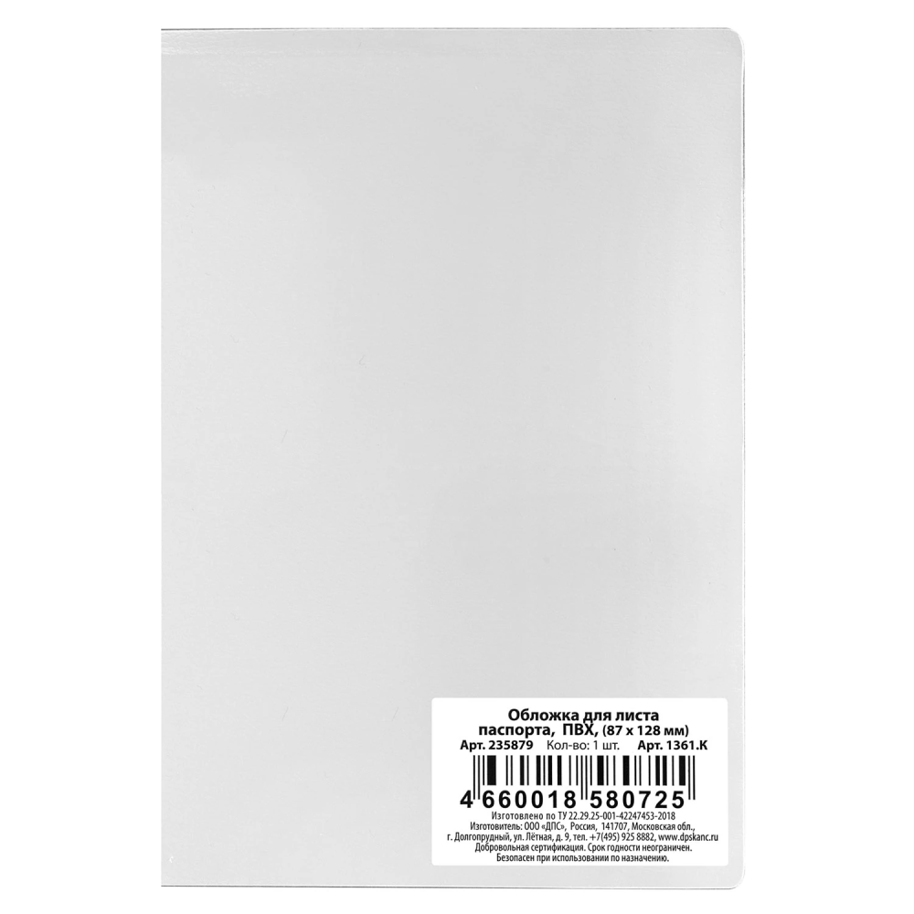 Обложка для листа паспорта, 128х87 мм, ПВХ, прозрачная, ДПС, 1361.К