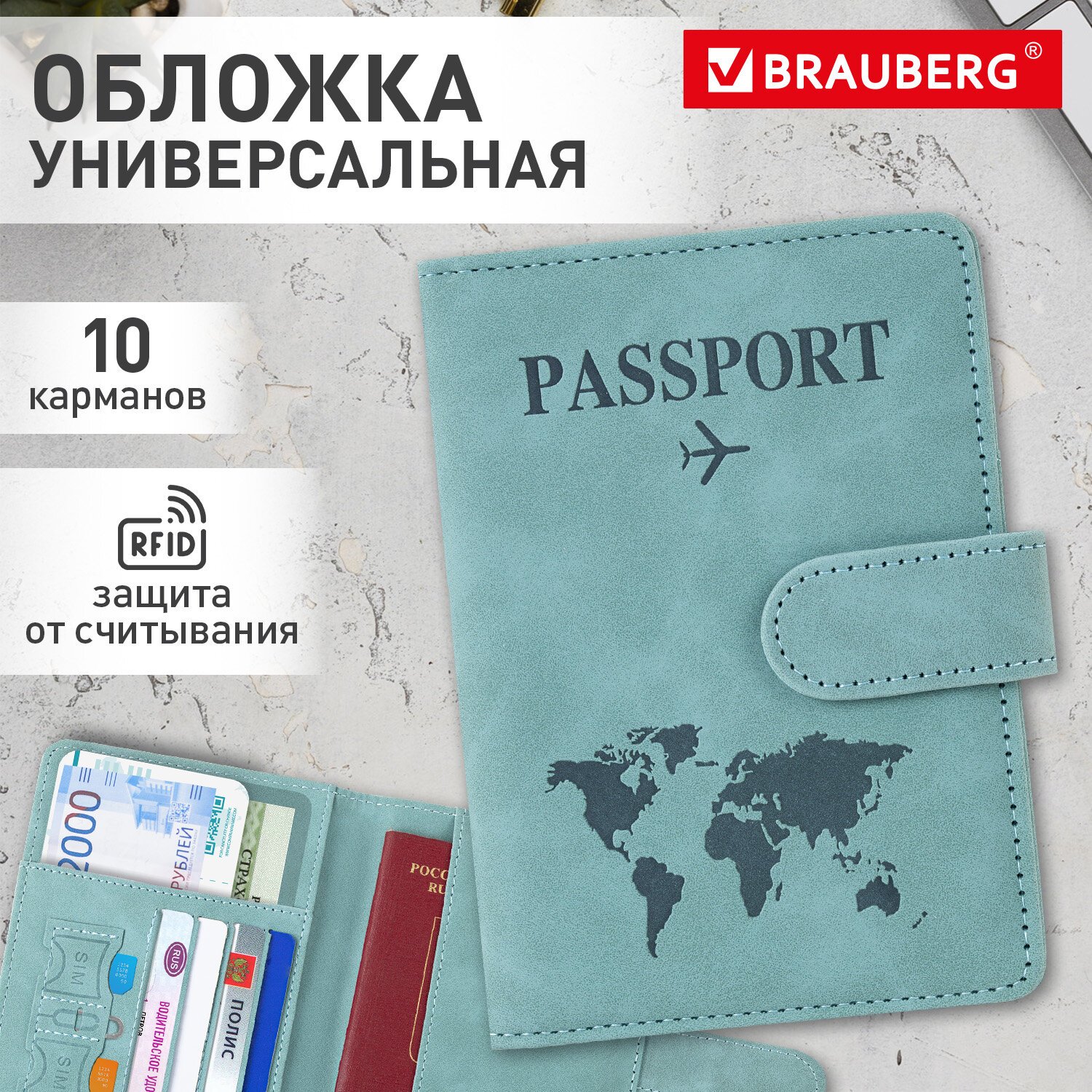 Обложка для паспорта и документов с защитой от считывания, 9 карманов, магнит, экокожа, бирюзовая, BRAUBERG, 238754