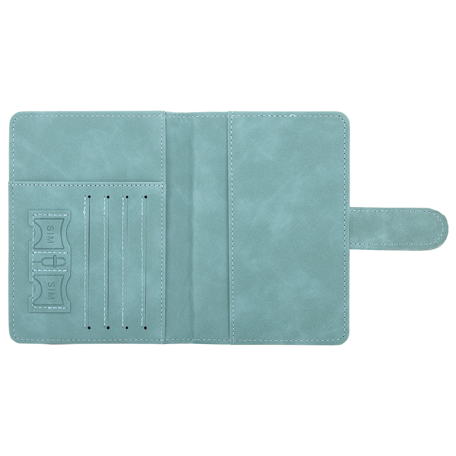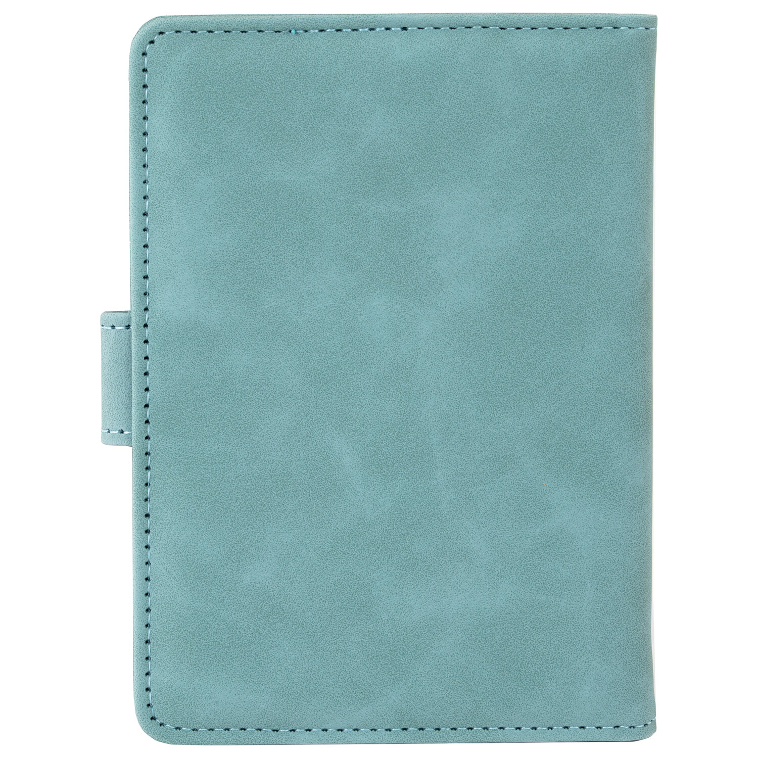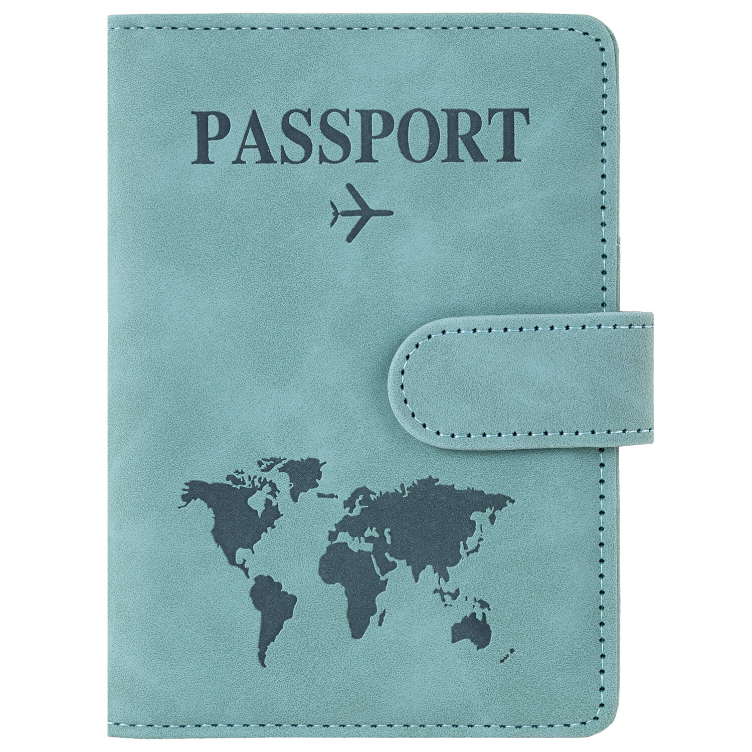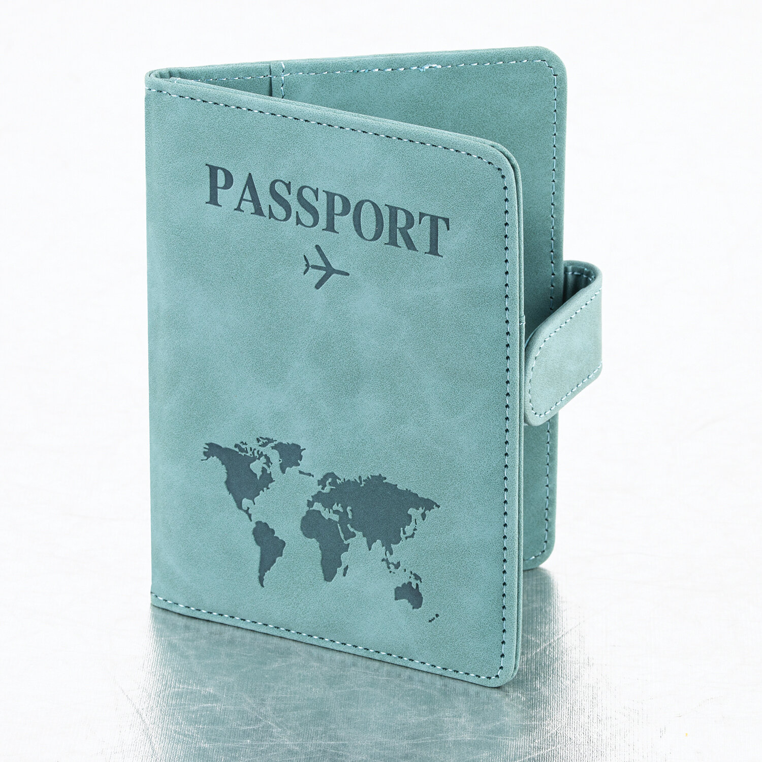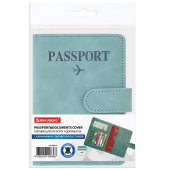 Модель выполнена из экокожи бирюзового цвета c приятной на ощупь soft touch-поверхностью и украшена тиснением в виде надписи "Passport", силуэта самолета и карты мира.