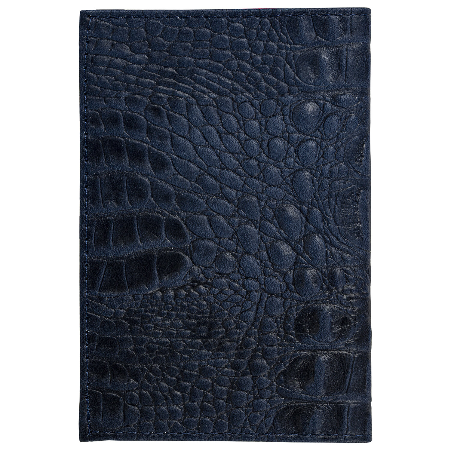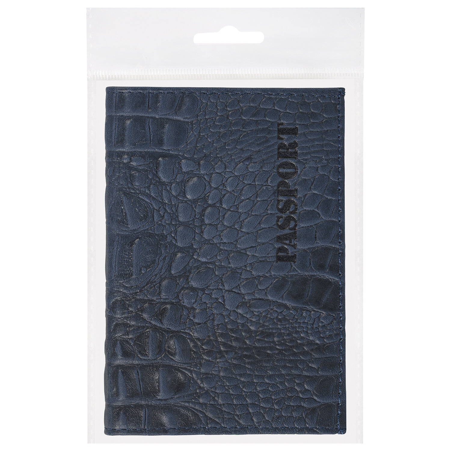 Модель выполнена из натуральной кожи с отделкой под кожу каймана глубокого темно-синего цвета, что подчеркнет стиль и изысканный вкус обладателя. Украшена тисненой надписью "PASSPORT", края прострочены. На внутреннем развороте расположены два кармана из прозрачного пластика. Упакована в пакет с европодвесом.