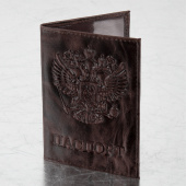 Модель выполнена из натуральной кожи в тёмно-коричневом цвете, что подчеркнет стиль и изысканный вкус обладателя. Украшена тисненой надписью "Паспорт" и государственной символикой "Герб", края прострочены. На внутреннем развороте расположены: с левой стороны - кожаный карман с отделениями для пластиковых карт, с правой стороны - карман из прозрачного пластика. Упакована в пакет с европодвесом.