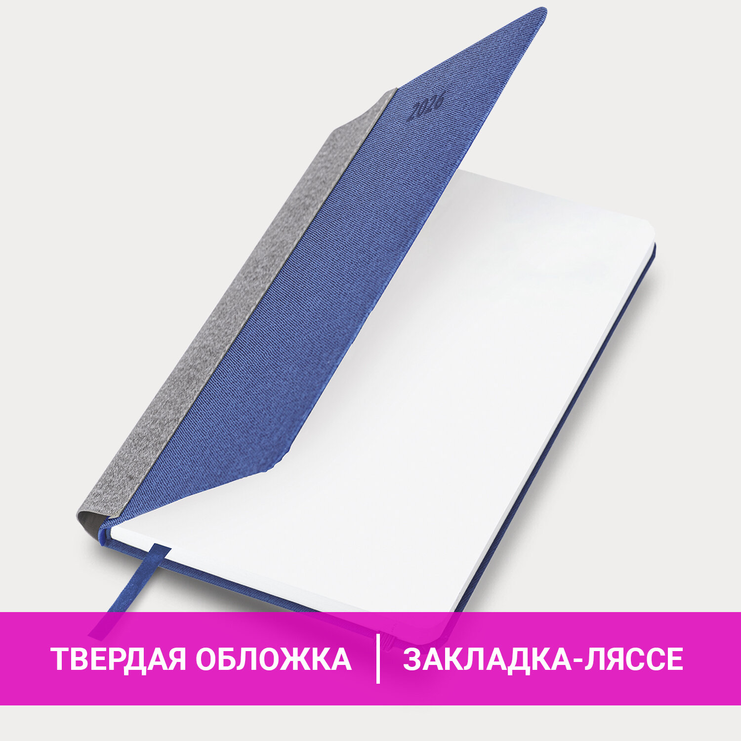 Выполнен в стильном сочетании синего и серого цветов. Жесткая книжная обложка стилизована под искусственную кожу с текстурой льна, фиксируется резинкой, поэтому ежедневник не откроется в сумке или портфеле и страницы не помнутся. Материал обложки подходит для горячего тиснения. Для удобства пользования ежедневник снабжен карманом для фиксации ручки. Дополнением является закладка-ляссе, с помощью которой при необходимости можно быстро открыть ежедневник на нужной странице.
