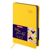 Твердая обложка стилизована под гладкую кожу яркого желтого цвета. Подходит для горячего тиснения. Срез и форзац ежедневника окрашены на контрасте с цветом обложки, что придает ему особый шарм. Дополнением является закладка-ляссе, с помощью которой при необходимости можно быстро открыть ежедневник на нужной странице.