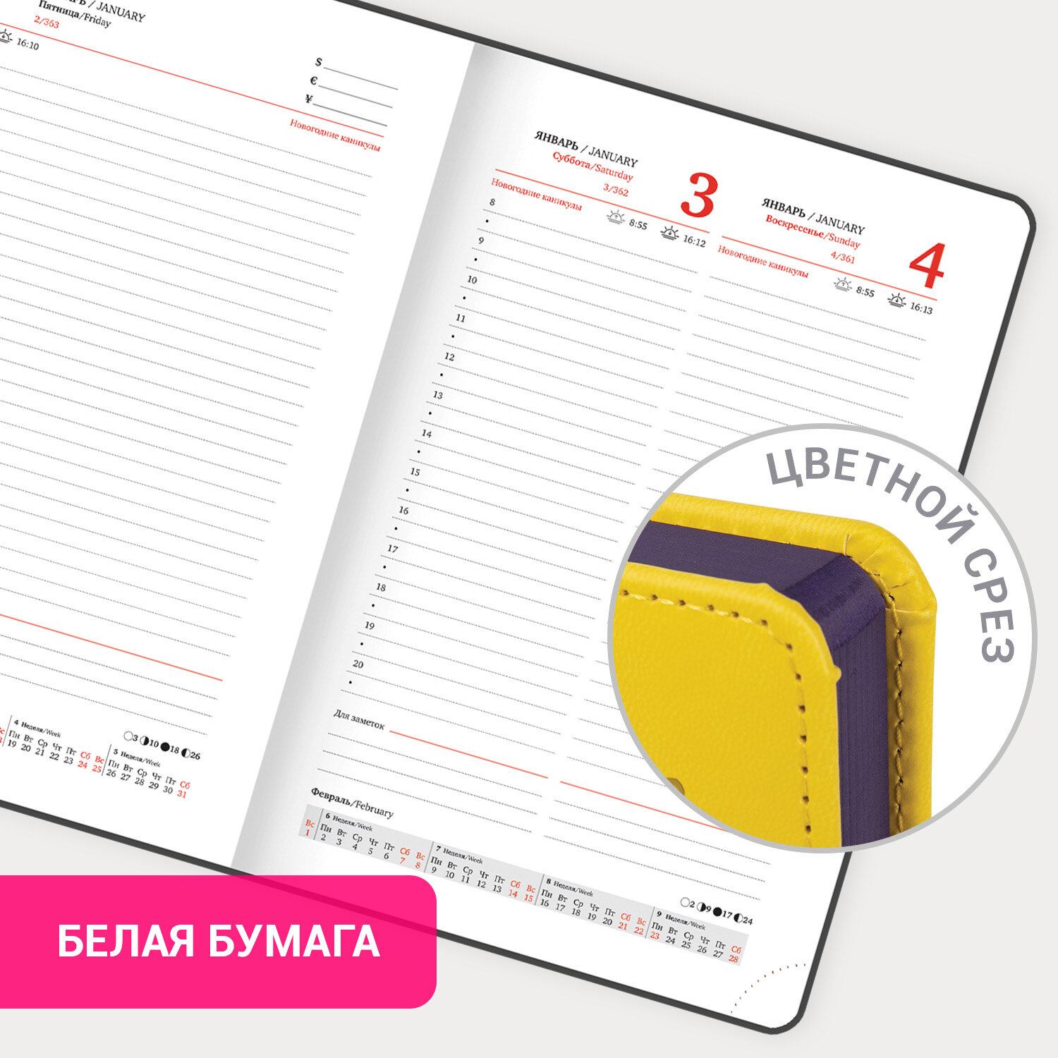 Обширный справочный материал дополнительно расширяет функциональность ежедневника. В конце внутреннего блока есть 4 страницы для записей и заметок.