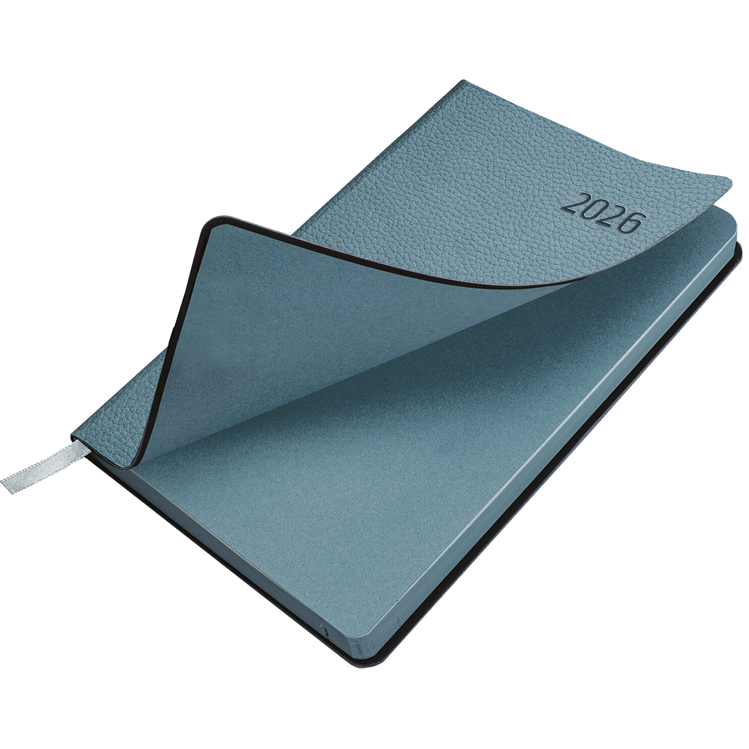 Мягкая (интегральная) обложка стилизована под фактурную кожу неординарного серо-голубого цвета. Подходит для горячего тиснения. Дополнением является закладка-ляссе, с помощью которой при необходимости можно быстро открыть ежедневник на нужной странице. Ежедневник снабжен справочным материалом. В конце есть 4 страницы для записей и заметок.