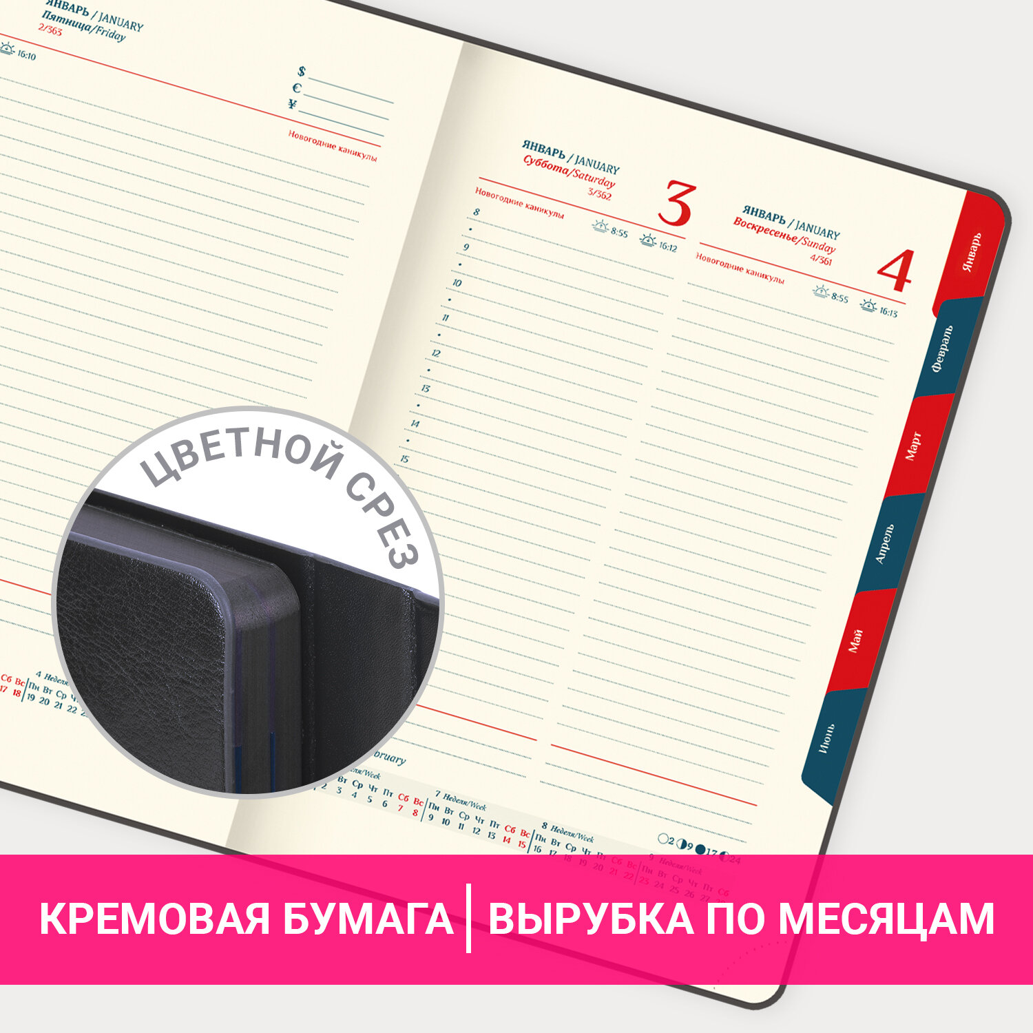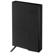 Внутренний блок включает 168 листов тонированной бумаги плотностью 70 г/м2. Каждая страничка имеет перфорированный угол. Благодаря стандартному формату А5 (148х218 мм) ежедневник удобно использовать как в офисе, так и на выездных деловых встречах. Интегральная обложка стилизована под гладкую кожу черного цвета, фиксируется магнитным клапаном, поэтому ежедневник не откроется в сумке или портфеле и страницы не помнутся. Подходит для горячего тиснения. Срез и форзац ежедневника окрашены в цвет обложки, что придает ему особый шарм.