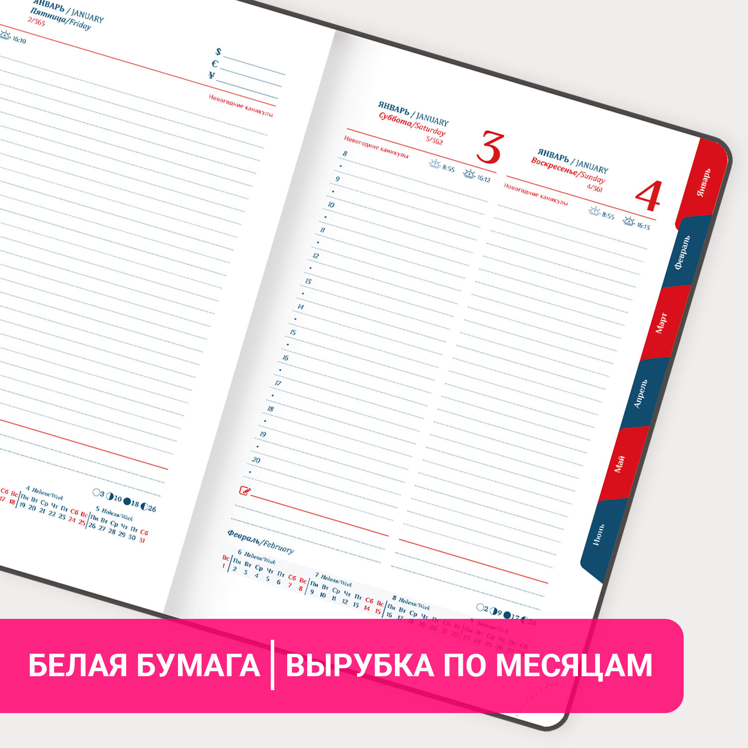Дополнением является закладка-ляссе, с помощью которой при необходимости можно быстро открыть ежедневник на нужной странице, а также вырубка по месяцам. Ежедневник снабжен обширным справочным материалом. В конце есть 6 страниц для записей и заметок.