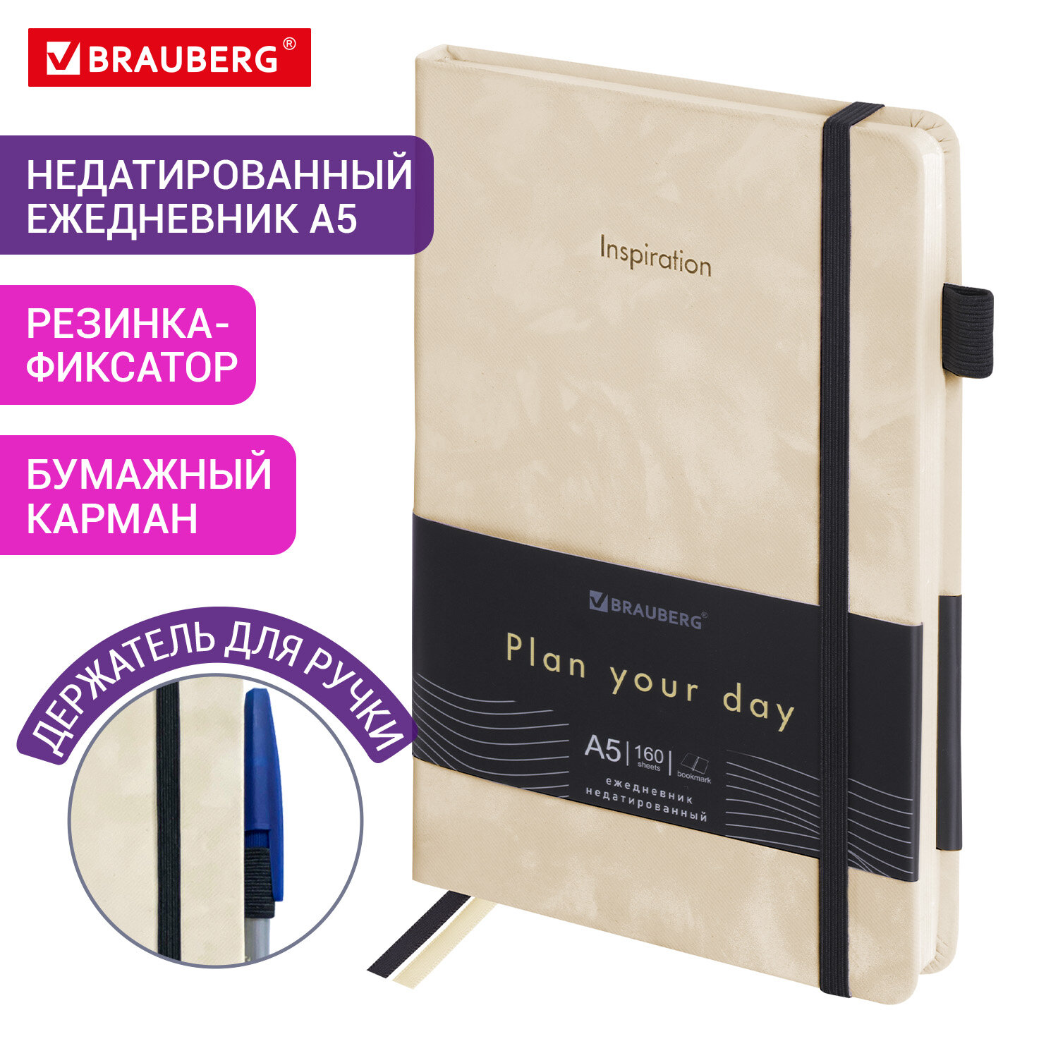 Ежедневник недатированный А5 138x213 мм, BRAUBERG "Velvet", резинка, держатель, 160 л., бежевый, 116244