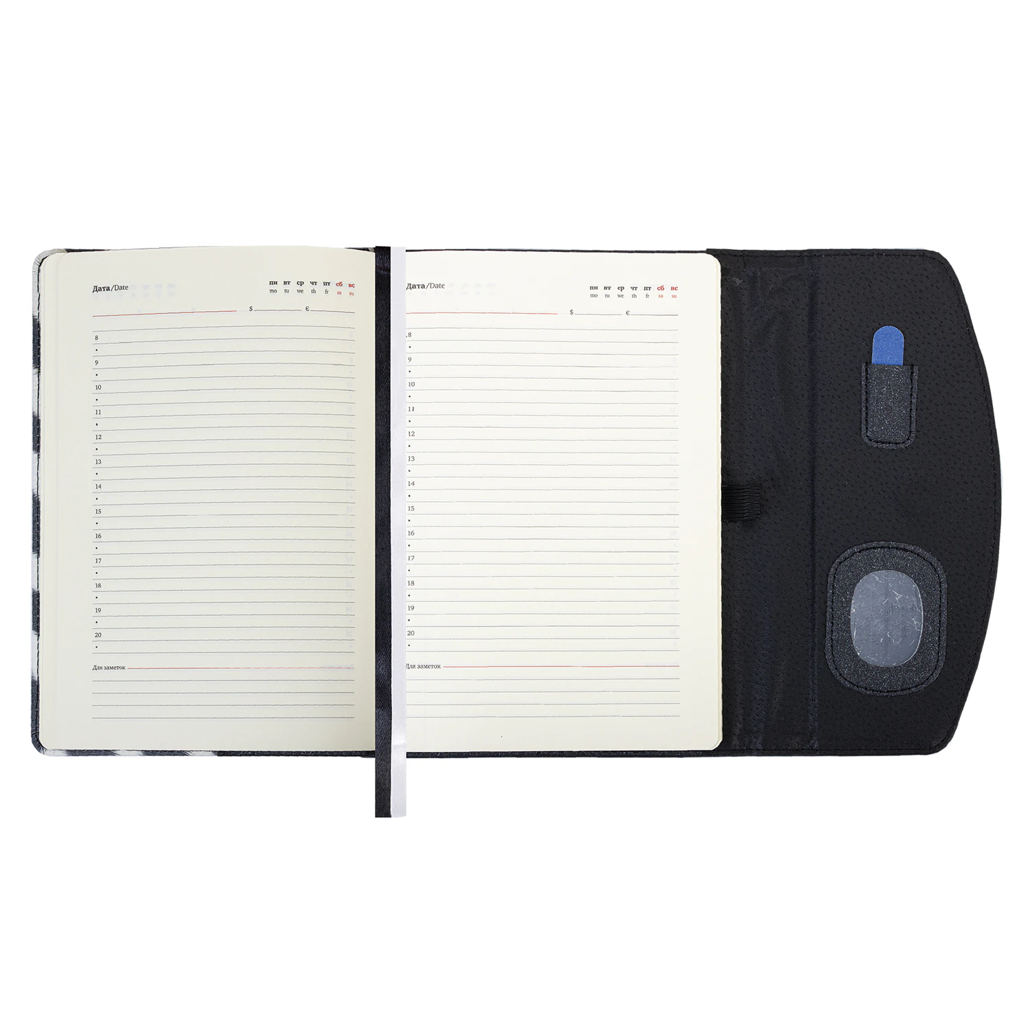 Внутренний блок включает 160 листов кремовой бумаги плотностью 70 г/м2. Благодаря стандартному формату А5 ежедневник удобно использовать как в офисе, так и на выездных деловых встречах.