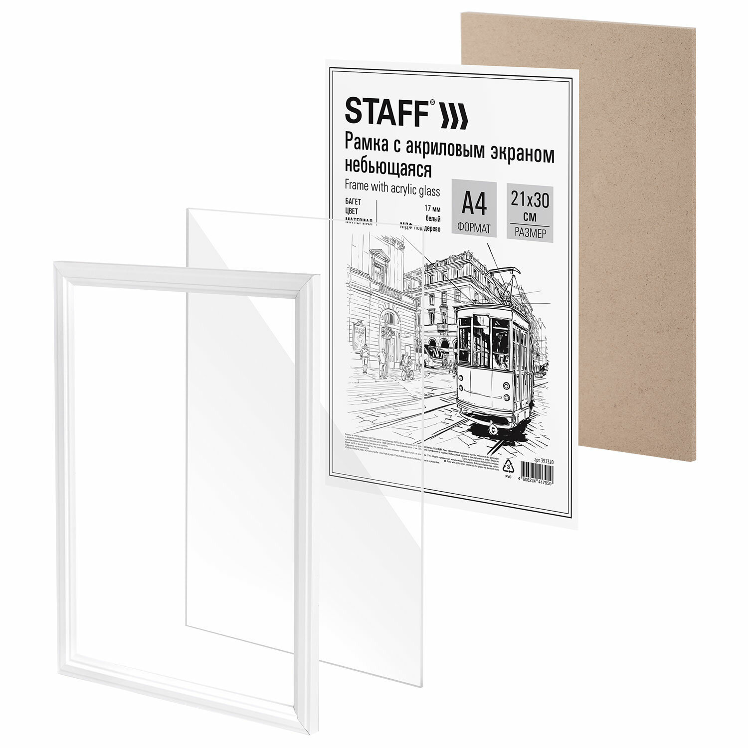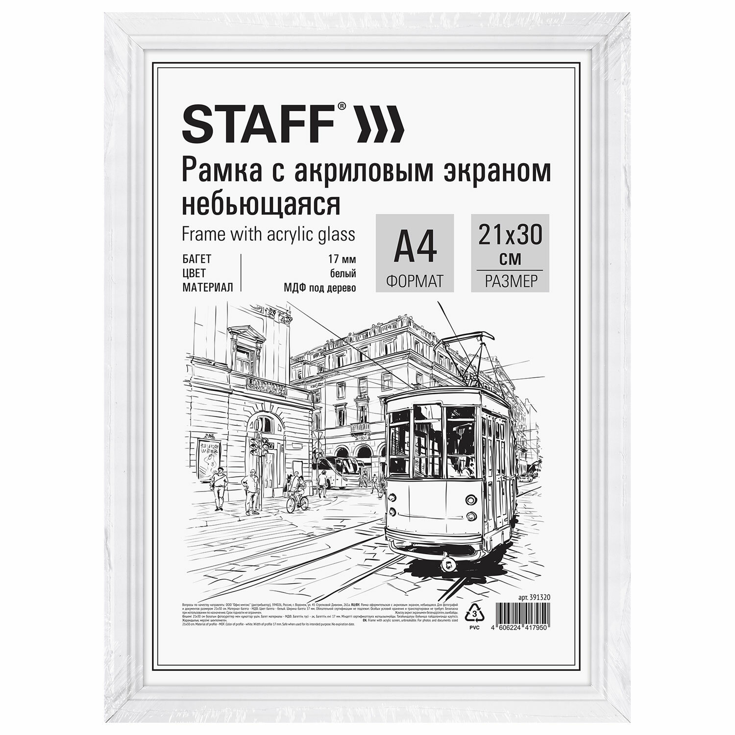 Рамка 21х30 см небьющаяся, багет 17 мм МДФ под дерево, STAFF "Carven", белая, 391320