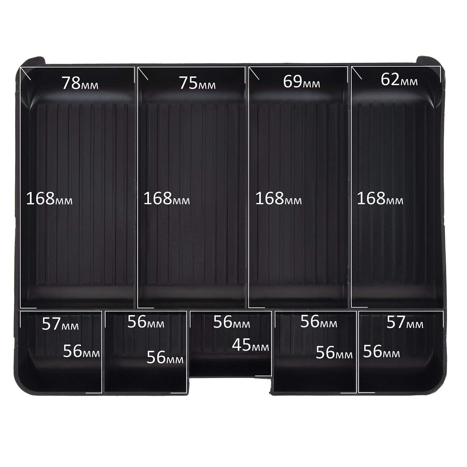 Съемный лоток из ударопрочного пластика с 9 отделениями: 4 для купюр и 5 для монет и украшений. Самая широкая ячейка - первая (78 мм). Она подходит для евро. Вторая ячейка - 75 мм. В нее входят белорусские купюры (72 мм). Третья ячейка - 68 мм. В нее войдут доллары США (66,3 мм). Российский рубль войдет в первые три ячейки. Четвёртая ячейка самая узкая - 63 мм. Подходит для карточек, ключей, печати. Под лотком есть пространство, где можно хранить документы и бумаги. Размер 30х24 см.