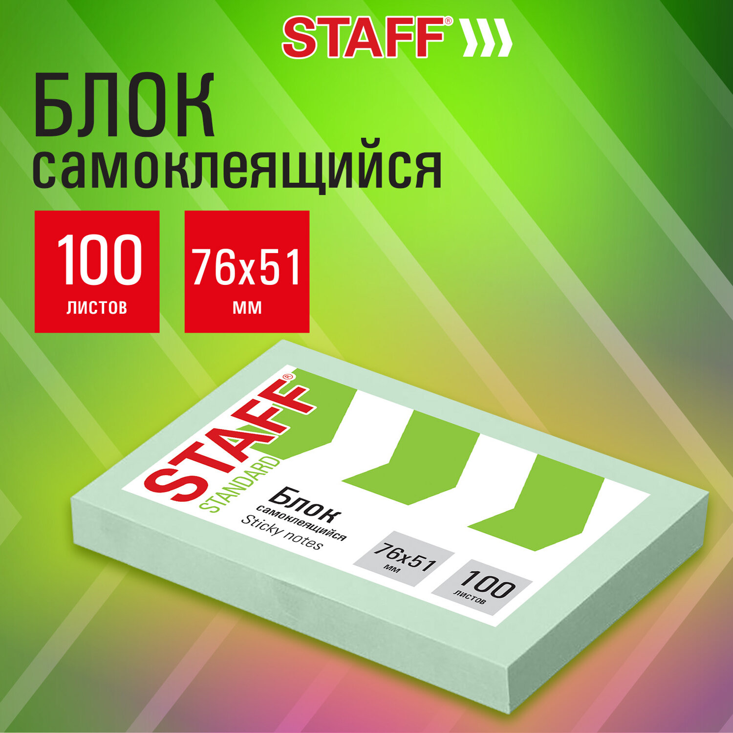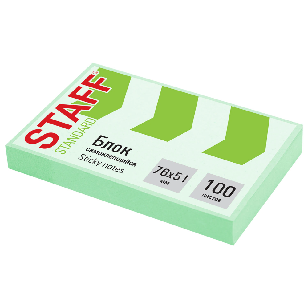Блок самоклеящийся (стикеры) STAFF STANDARD, ПАСТЕЛЬНЫЙ 76х51 мм, зеленый, 100 листов, 116583