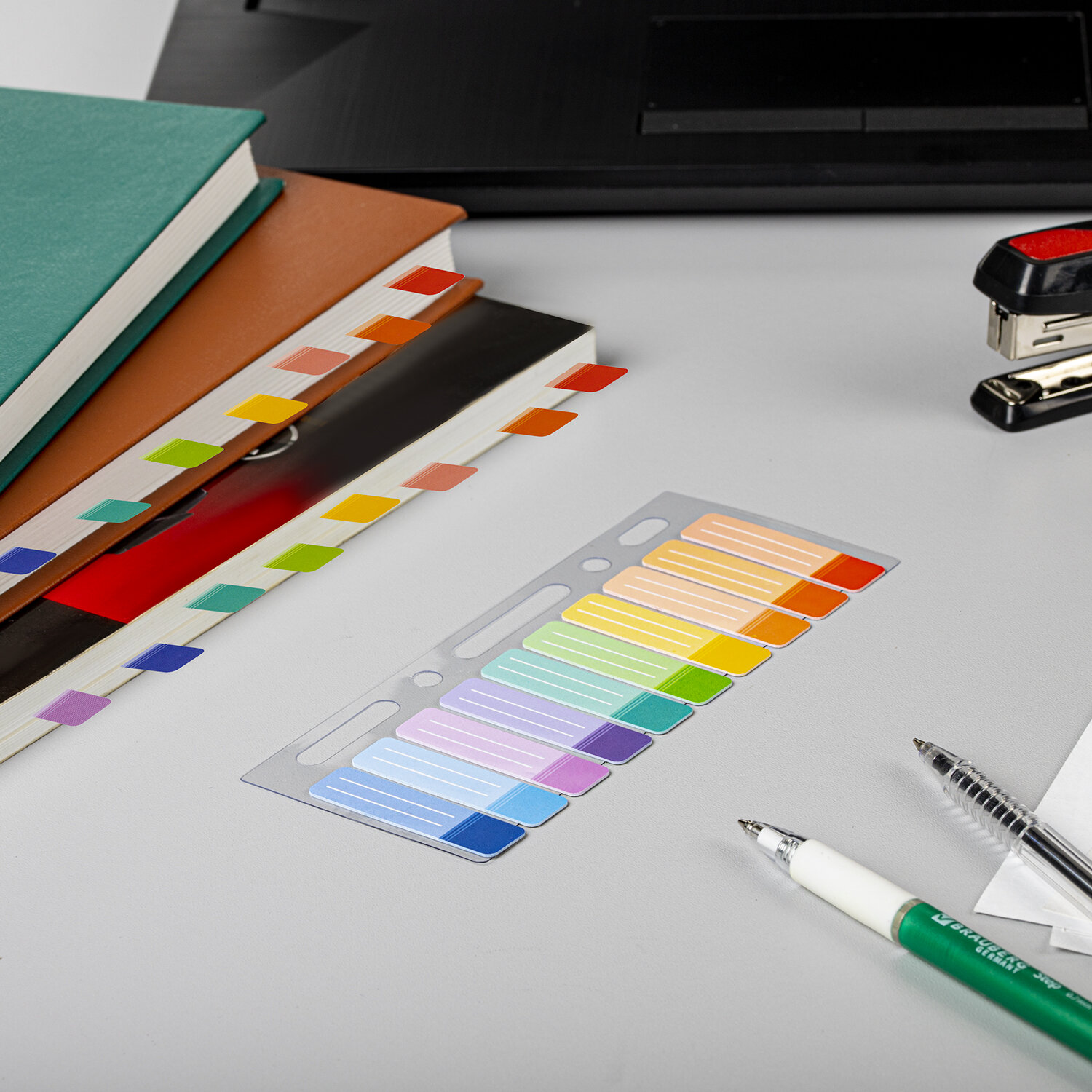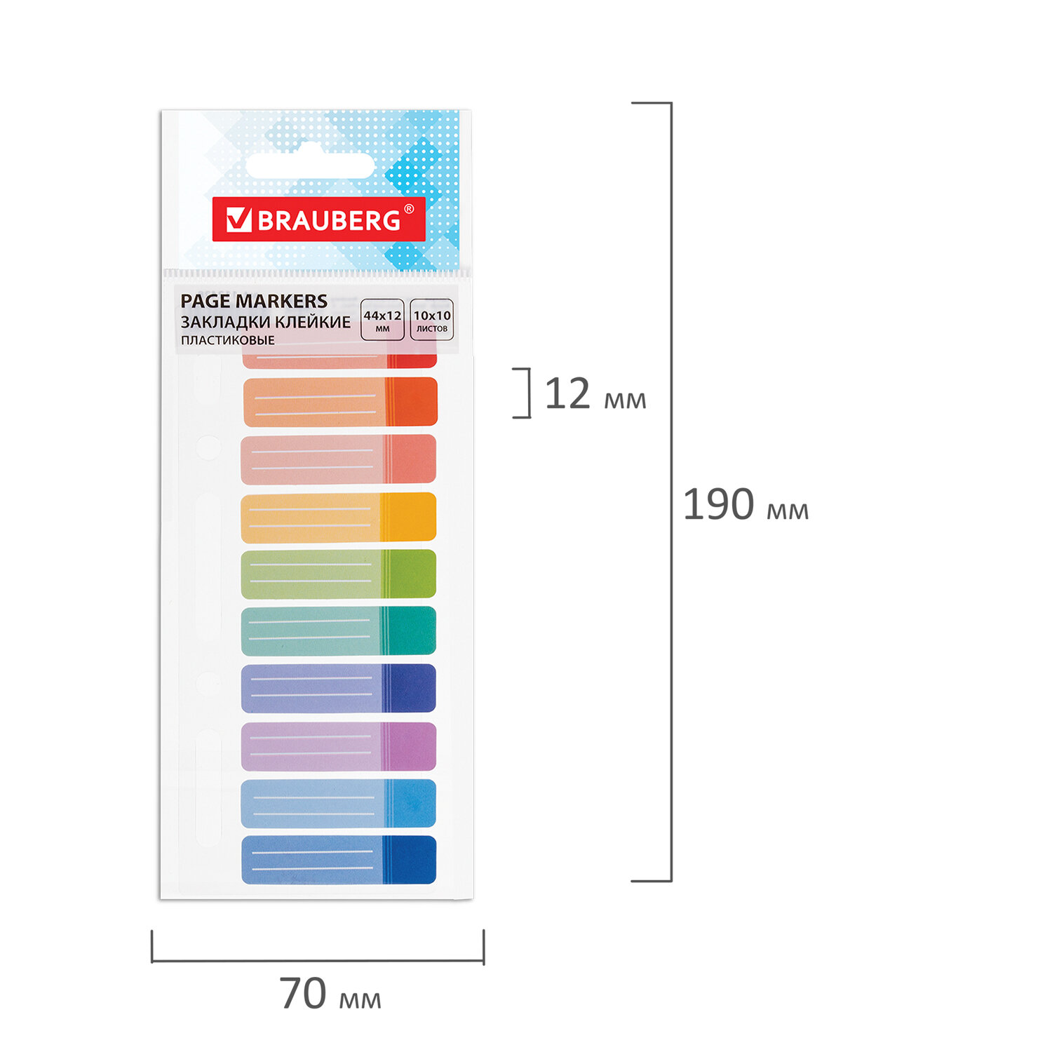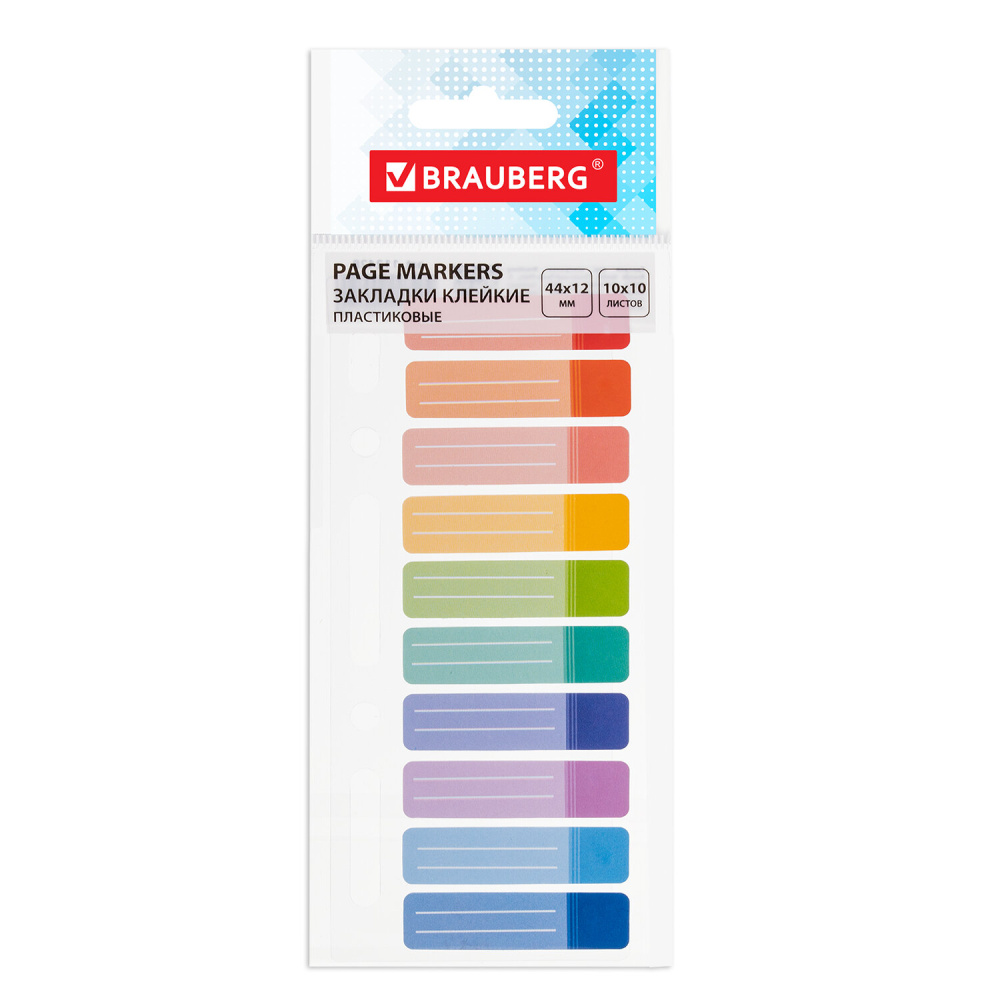 Закладки клейкие BRAUBERG, 44х12 мм, 100 штук (10 цветов х 10 листов), на пластиковой линейке 15 см, 112428