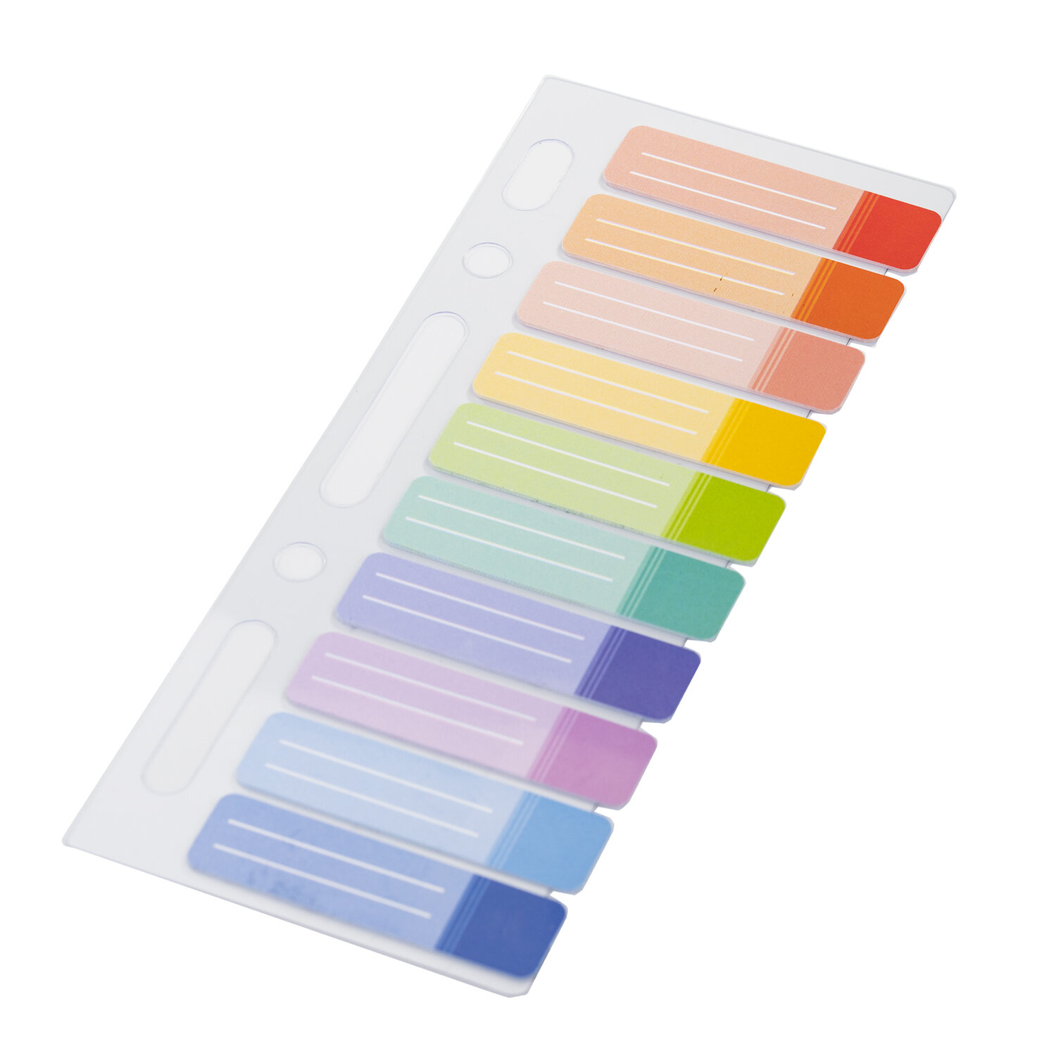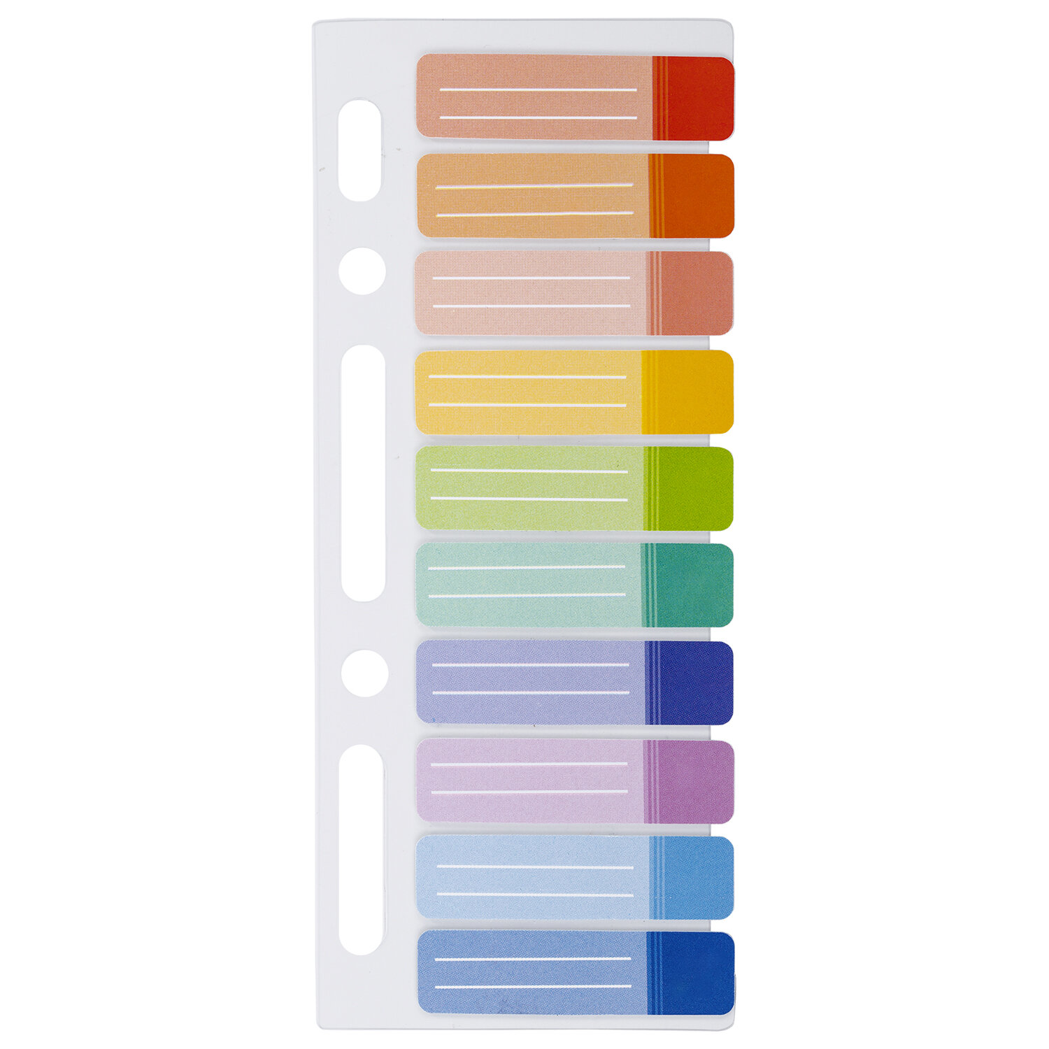 Набор пластиковых закладок 10 цветов состоит из 100 листов, по 10 закладок каждого цвета. Клейкий слой - 35 Н/м. Легко клеятся к любой поверхности и не оставляют следов. Материал закладок позволяет делать на них надписи ручкой и карандашом. Уложены на пластиковом основании. Поставляются в полиэтиленовом пакете с европодвесом.